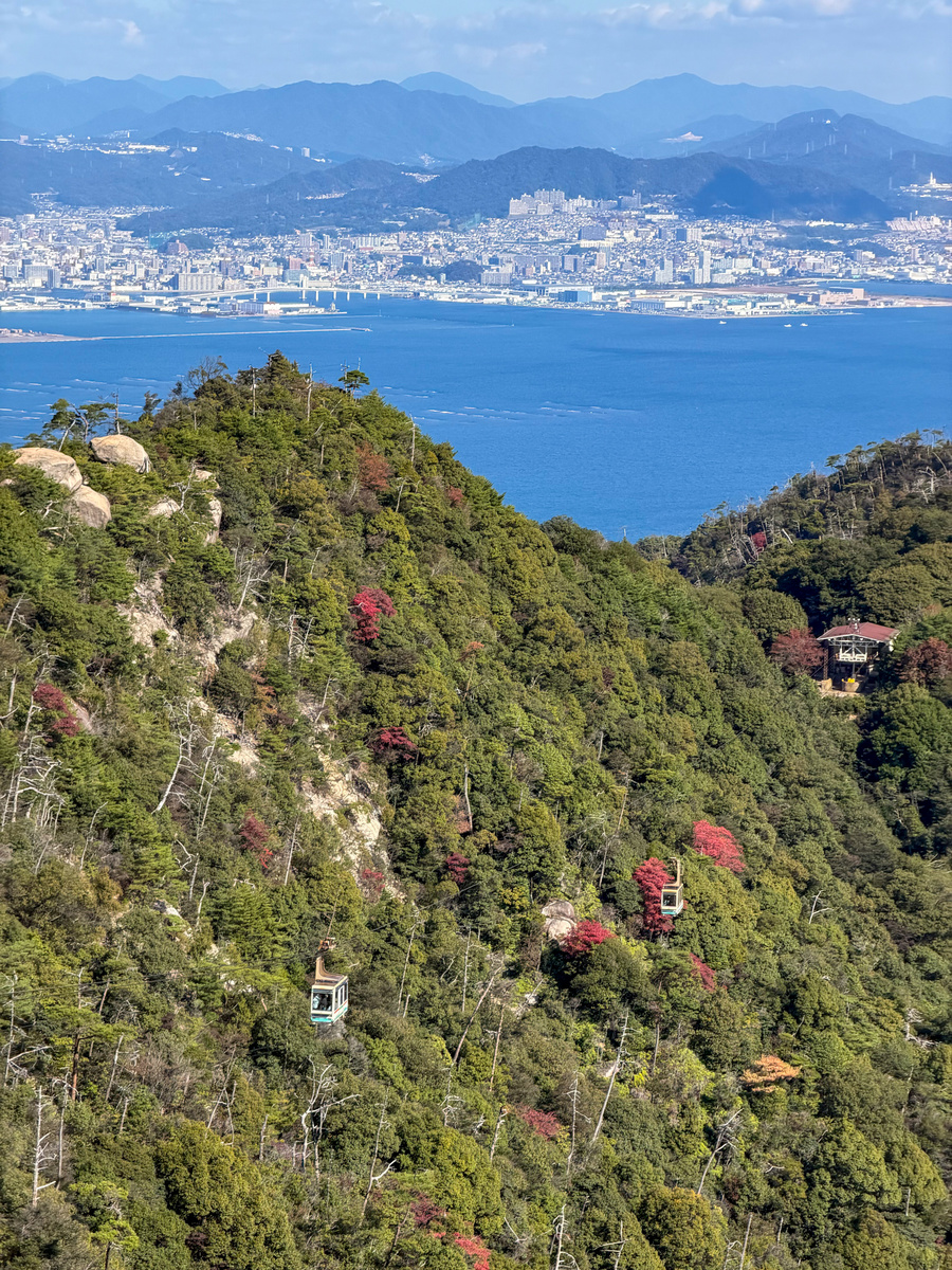А чем ещё заняться на Миядзиме, кроме прогулок по храмам с оленями? Забраться на гору Мисэн! Подняться можно или пешком по тропам или по канатной дороге. Высота горы около 500 м, поэтому подъём может быть трудным для неподготовленных. Зато, если что, можно спуститься. Однако, у нас время было ограничено и мы в обе стороны воспользовались канатной дорогой. Стоимость – 2000 йен туда-обратно. Купить билеты можно или в офисе рядом с паромной переправой, или на станции канатной дороги. Виды с высоты открываются великолепные на 360 градусов! И море видно, и Хиросиму видно, и горы. От верхней станции канатной дороги можно подняться ещё выше к храму Miyama Shrine и на ещё одну смотровую площадку. Но у нас в семействе есть один ленивый человек, который категорически сопротивлялся каким-либо физическим нагрузкам, ибо мы и без этого каждый день проходили по много тысяч шагов. Говорят, что спуск проходит через храмы и другие красивые места в гуще леса. Возможно в следующий раз мы совершим эту прог