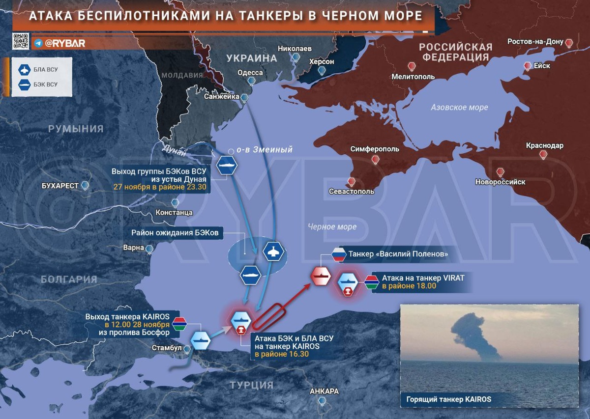 Днем в 90 км северо-восточнее пролива Босфор на танкере «Каирос» (под флагом Гамбии) произошел взрыв. Танкер примерно в 12 часов вышел из пролива Босфор и направлялся в Новороссийск. Турецкие СМИ описали причину как «внешнее воздействие». Спустя пару часов журналисты начали разгонять версию с подрывом танкера на мине. Однако причина иная – на танкер была осуществлена атака беспилотниками ВСУ. Под вечер появились сообщения об еще одной атаке на танкер под флагом Гамбии под названием Virat. В этой атаке противник использовал 5 БЭКов, которыми нанесен удар с кормы судна. 🔻Как прошли нападения? ▪️Вчера в 23 часа из района бассейна реки Дунай вышла группа безэкипажных катеров. Они приблизились к Змеиному, после чего двинулись в юго-восточном направлении в момента налета БЛА на Крым. ▪️После этого они перестали фиксироваться в международных водах параллельно румынской Констанце, заняв позиции в районе ожидания. ▪️Утром «Каирос» начал проход проливом, после завершения которого двинулся в се