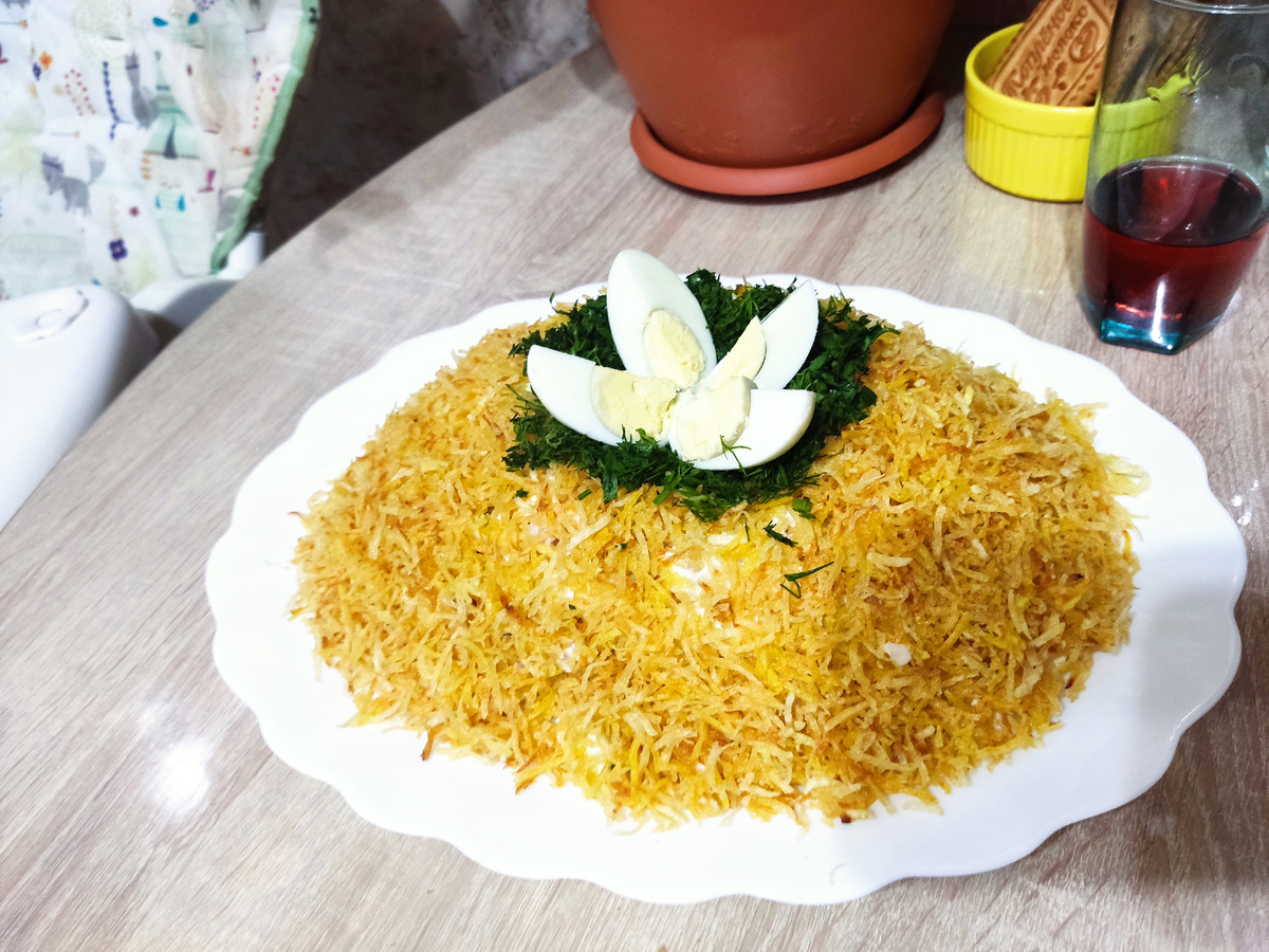 Пробуем , тренируемся готовить салатик для новогоднего стола . У стандартным салатам можно добавить вот такой необычный салат. Для приготовления понадобится : Яйца -6 шт. (1 для украшения ) Куриная грудка - 450 гр. Лук маринованный - 1 луковица Соленые огурцы - 3 шт. Майонез - 70 но. Картофель - 5 шт. ( Для украшения ) Горчица - 20 гр. Масло подсолнечное - 200 мл. Соль и сахар - по 1 чл. Зелень для украшения - укроп и петрушка по 2 веточки. Отвариваем куриную грудку, яички тоже отвариваем. Нарезаем соленые или маринованные огурцы , какие кто любит . Лук репчатый нарезаем кубиками, заливаем кипятком,что бы убрать горечь. Добавляем ложечку чайную соли и сахара, яблочный уксус . Получается маринованный лучок. Нарезаем кубиками куриную грудку , огурчики, яички, добавляем лук. Картофель чистим, натираем на тёрке и промываем под холодной водой . Откидываем на сито, что бы убрать лишнюю жидкость. Наливаем подсолнечное масло в сковороду, нагреваем и не большими порциями кладём в горячее м