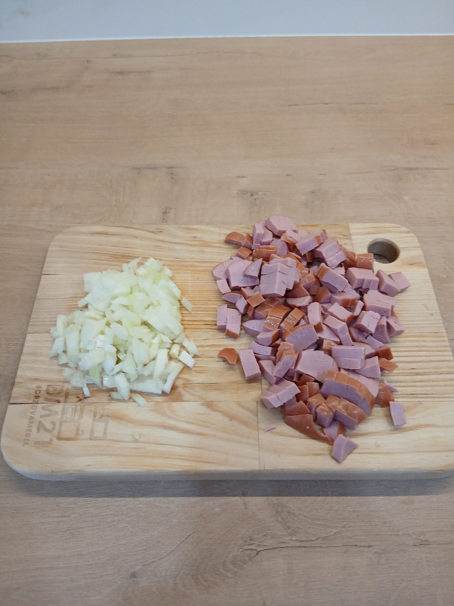 Растительное масло — для жарки 1) Шинкуем репчатый лук полукольцами. Нарезаем колбасу небольшими кубиками. Свежий помидор режем мелкими кубиками. 2) Разогреваем растительное масло на сковороде, выкладываем нарезанный лук и пассируем его до золотистого цвета. Добавляем нарезанные кусочки колбасы и обжариваем вместе пару минут. После этого отправляем в сковороду нарезанный помидор и продолжаем готовить ещё около минуты. 3) Готовим вермишель согласно инструкции на упаковке. Обычно её заливают кипятком и оставляют на указанное производителем время. 4) Пока вермишель готовится, взбиваем венчиком три яйца в глубокой тарелке. Натираем сыр на мелкой терке.
