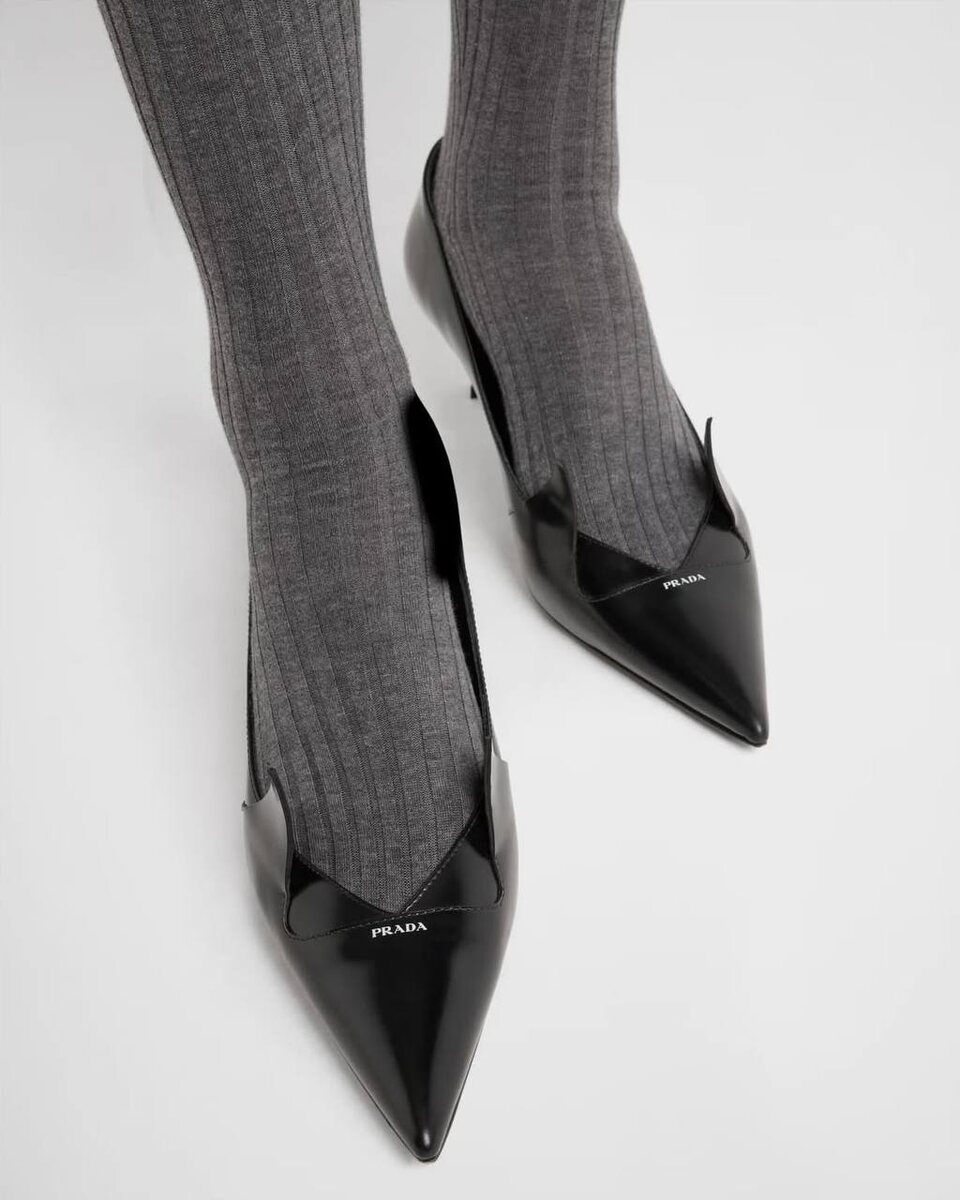 Показываю свежий релиз: острый нос, «рожки» из кожи, почти архитектурная форма выреза и небольшой каблук. Это одновременно и ретро, и что-то абсолютно современное — очень в духе Prada, когда простая лодочка вдруг превращается в предмет дизайна.