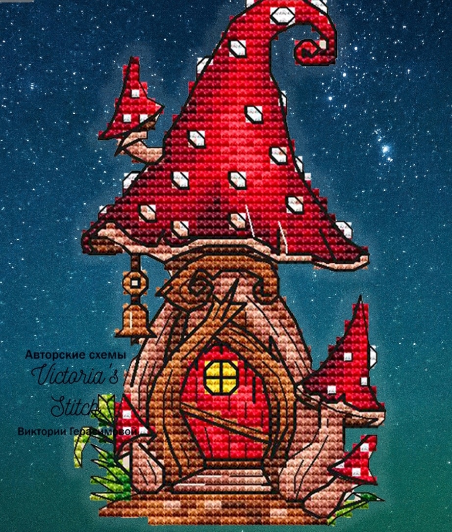 Вот так всегда! Нет выполнять задуманные планы на месяц, а меня понесло совсем в другую сторону! С творчеством Виктории Герасимовой я познакомилась благодаря совместнику в группе автора ВК. И главное ведь можно было с любыми работами участвовать, но то ли азарт( в отдельных заданиях за работы Виктории засчитывается дополнительный балл), то ли просто желание познакомится с автором поближе через его схемы, вылилось все в покупку очень интересного дизайна -"Домик-мухомор". У автора целая серия этих домиков. Вот превью некоторых из них, которые мне особенно понравились 👇👇👇 Я думала,что буду отшивать его потихоньку, в рамках СП, но когда я его взяла в работу поняла как он прекрасен! И шьётся то легко,словно песня! Вообщем отчитывалась я с ним всего два раза. Первый раз отшила 202 крестика. Потом,вне СП ещё 117. За второй отчет уже целых 1200 крестиков за сутки! Промежуточный результат Вышивала даже когда отключили свет! У нас это история частая и я уже привыкла рукодел