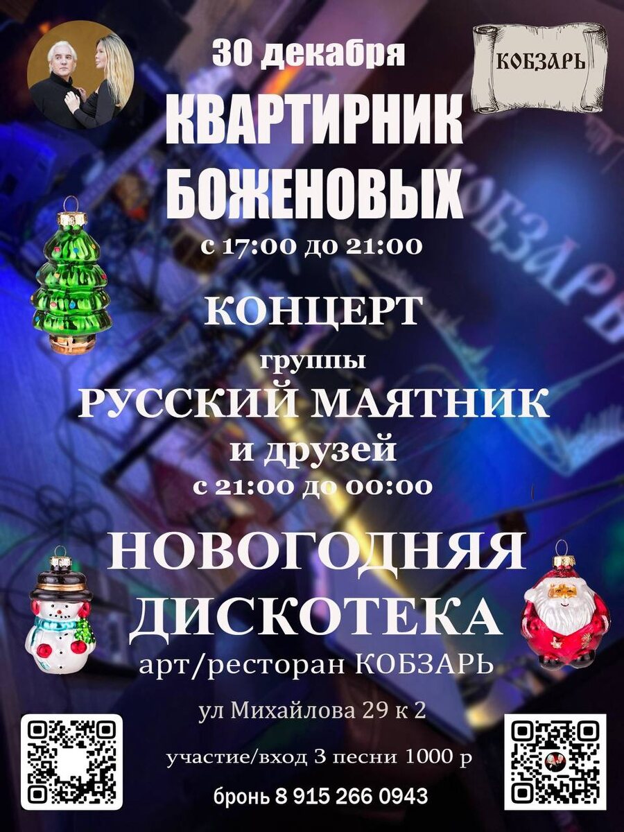 🎤✨ Приглашение на уютный квартирник Боженовых! ✨🎸 Дорогие артисты, певцы и все, кто любит живое исполнение и душевную атмосферу! 30 декабря приглашаем вас на особый творческий вечер — квартирник Боженовых в ресторане «Кобзарь». 📍 Время: с 17:00 до 21:00 📍 Место: ресторан Кобзарь 🎶 После концерта группы Русский Маятник и дискотека под любимые каверы — провожаем старый год красиво и музыкально! ⭐ Формат участия Каждый желающий артист может исполнить 2 песни на нашей уютной сцене. Стоимость участия — 1000 рублей. 🎥 По желанию: Профессиональная видео-съёмка вашего выступления — 1000 рублей. Мы выложим материал на наших ресурсах и отметим ваши аккаунты, чтобы о вас узнали новые слушатели! ❤️ Вас ждёт: — Тёплая атмосфера — Живая музыка — Новые знакомства — Свобода творчества — Праздничное настроение перед Новым годом Хочешь выступить? Пиши нам — и займём тебе место в списке артистов 🎤✨ Будем рады видеть каждого, кто хочет поделиться своим голосом и настроением накануне нового года! 🎄