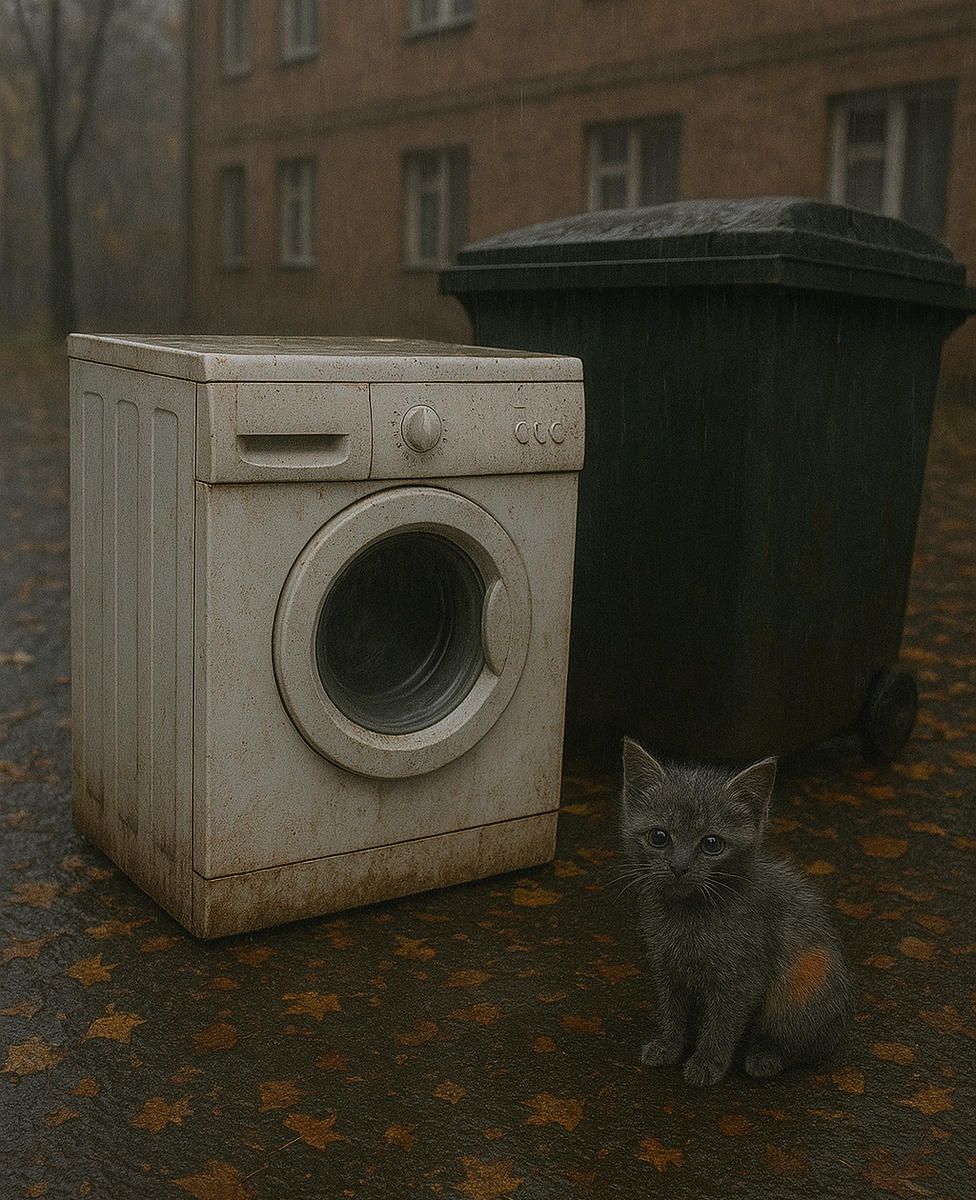 …Пошёл мелкий дождик. Голуби улетели, так и не доклевав кусочек грязного хлеба. Возле бака откуда-то появился мокрый дрожащий и жалобно мяукающий серый комочек. Он ходил вокруг бака, пытаясь укрыться от холодного дождя, потом наткнулся на неё. Котёнок был грязный и серый, с большим рыжим пятном на боку. Она приоткрыла люк, чтобы котёнок увидел убежище. С нескольких попыток ему удалось забраться в её утробу. Он перестал мяукать, но продолжал трястись от холода. Теперь они были вдвоём. Она подумала, что на свете есть ещё много никому не нужных душ, и ей стало совсем грустно…