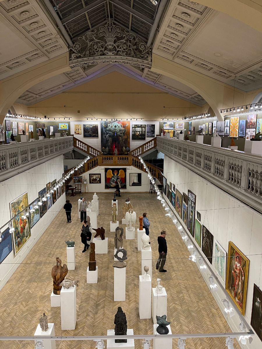 В Союзе Художников на Большой Морской, 38 через пару дней заканчивается выставка, посвящённая осени. Хорошо, что я успела сегодня забежать, давно не была там и уже успела соскучиться по этим камерным гигантским залам. Кстати, очень люблю именно тематические выставки. Одно и то же явление глазами множества художников подаётся совершенно по-разному. У каждого из них свои краски, настроение, ритм. Можно увидеть разные направления искусства и почувствовать масштаб творческих работ. Кому интересно и кто не успевает посетить, я сняла небольшой обзор. К сожалению, забыла сфотографировать авторов. Но у меня есть знакомые среди устроителей выставки, так что, если что-то впечатлило, напишите, можно будет напрямую выйти на художников. Что запомнилось? Многое.. Уровень современных художников впечатляет. Сегодня ещё удалось пройти по закрытой лестнице в стиле модерн, где сверху льётся мягкий свет через изящный стеклянный потолок. Остановилась у двери, за которой когда-то была квартира Н. Рериха.