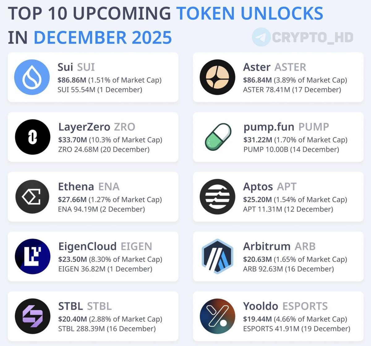 #анлок 🔐 Крупнейшие разблокировки альткоинов в ноябре: ▫️ #SUI – $86,86m ▫️ #ASTER – $86,84m ▫️ #ZRO – $33,70m ▫️ #PUMP – $31,22m ▫️ #ENA – $27,66m ▫️ #APT – $25,20m ▫️ #EIGEN – $23,50m ▫️ #ARB – $20,63m ▫️ #STBL – $20,40m ▫️ #ESPORTS – $19,44m Crypto Headlines
