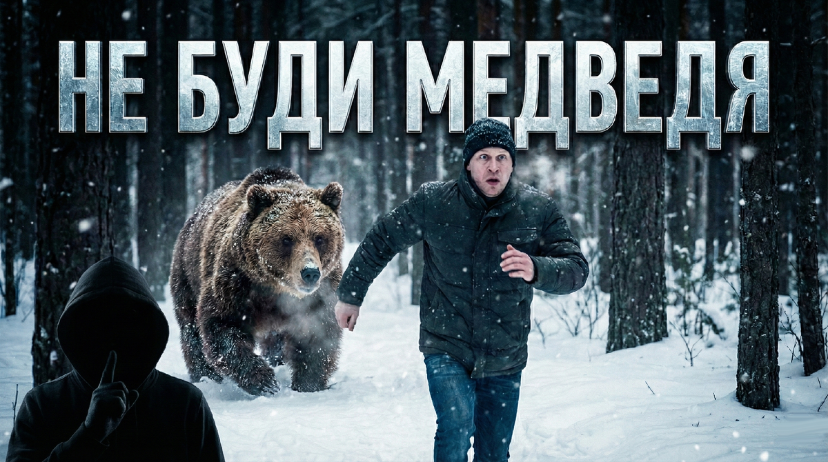 Сделай с этими персонажами кинематографичный постер "Не буди медведя". Испуганный мужчина, бегущий по лесу, гонящийся за ним медведь и силуэт в левом нижнем углу, прикладывающий палец к губам "тс-с-с". Соотношение сторон 16:9.