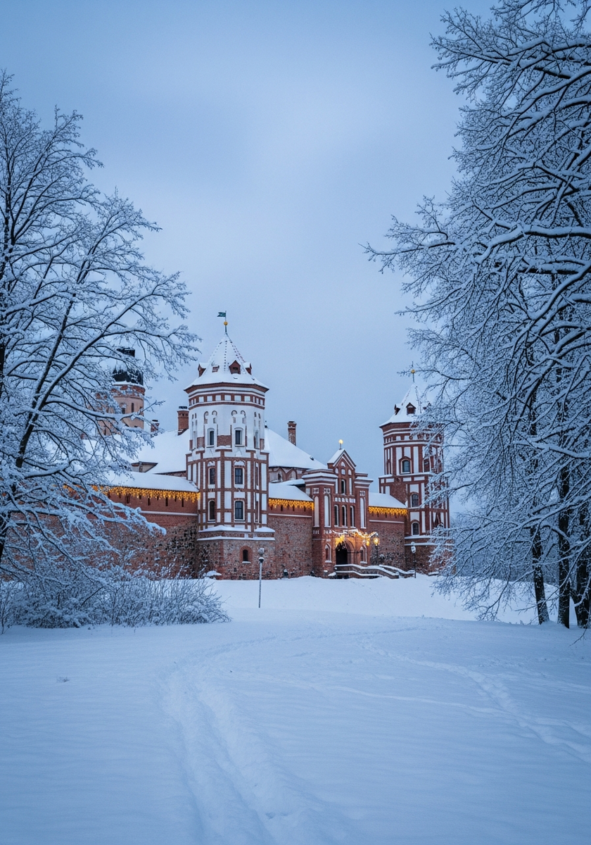 Величественный замок шестнадцатого века зимой выглядит особенно живописно, когда снежный покров подчеркивает мощь древних стен и башен. Это один из красивейших образцов белорусской готики и объект Всемирного наследия ЮНЕСКО.