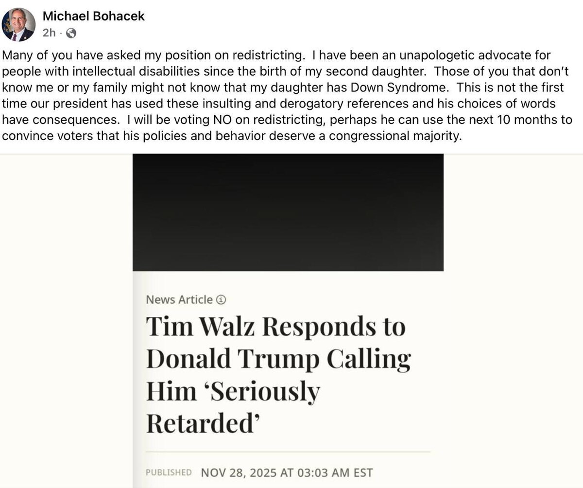 Indiana Republican Michael Bohacek says he’ll vote against redistricting in order to teach Trump a lesson He said maybe Trump ‘can use the next 10 months to convince voters that his policies and behavior deserve a congressional majority’ Redistricting would've helped the GOP