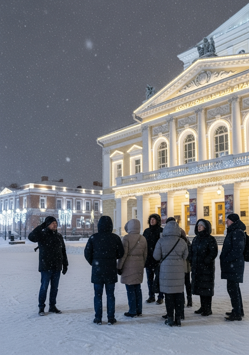 Сердце новогодней Калуги с главной елкой города и праздничными гуляньями. Здесь сосредоточена вся праздничная атмосфера — от ярмарок до концертов, от хороводов до фейерверков.