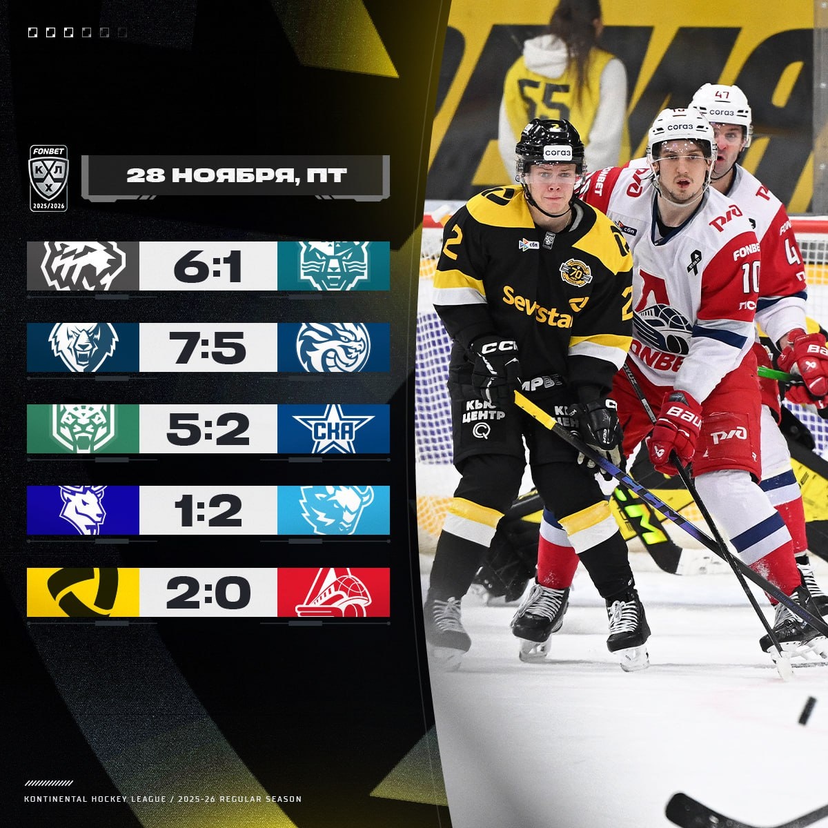Хоккей вчера был многослойным — то стремительным, то жёстким, то почти тонким в деталях. Одни команды давили силой, другие — терпением, третьи — творили за счёт чистой энергии момента. Это был день, когда каждая игра оставляла свой след и формировала общий ритм вечера. Ак Барс — СКА 5:2 Казанцы чувствовали игру лучше. Они вели матч, не давая СКА навязать свою структуру. Лайпсик сделал дубль, но этого оказалось слишком мало — защита армейцев давала сбои, а Ак Барс контролировал площадку так, будто держал нитку всей встречи в руках. Северсталь — Локомотив 2:0 Игра, построенная на концентрации. Северсталь действовала строго, аккуратно, без лишнего риска. Самойлов оформил сухарь, как итог идеальной командной работы. «Локомотив» искал скорость, но каждый раз упирался в чёткую структуру хозяев. Динамо Минск — Торпедо 2:1 Матч выстоявших против наступающих. 37 бросков Торпедо — это не просто цифра, это давление, которое накатывало волнами. Но минчане выдержали всё и реализовали сво