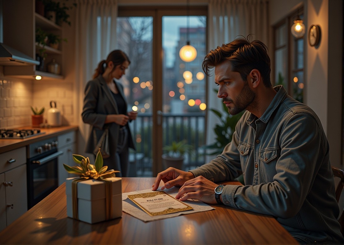 На столе лежал сложенный вдвое конверт — плотная матовая бумага, золотой логотип спа-салона в углу. Рядом — чек из торгового центра и крошечный обрывок подарочной упаковки. Андрей перевёл взгляд на телефон: мессенджер показывал «онлайн», но зелёный кружок рядом с именем жены не грел.