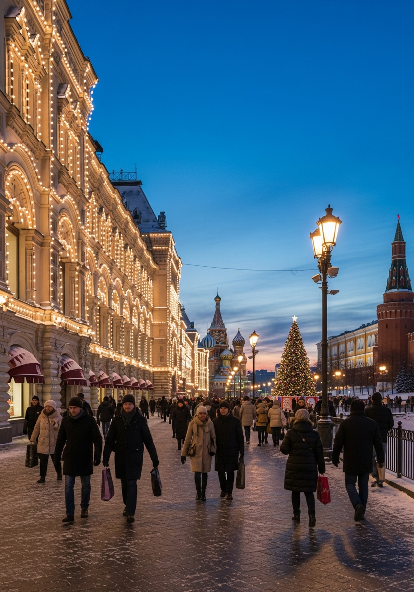 Древняя крепость и резиденция власти впечатляет в любое время года, но декабрьский Кремль особенно величествен. Золотые купола на фоне зимнего неба, заснеженные стены и главная новогодняя ёлка страны создают незабываемую атмосферу.