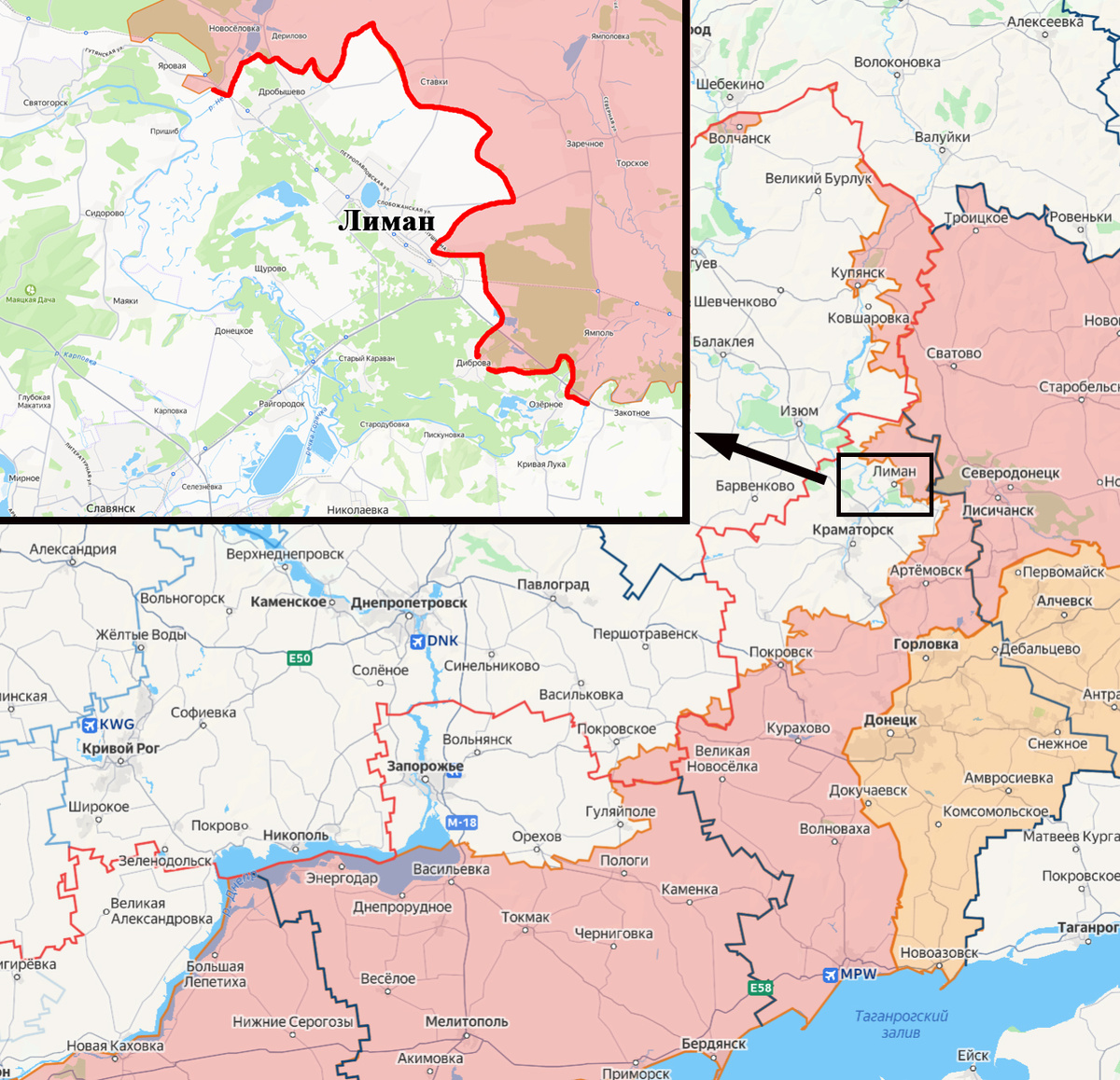 Не всё же о Гуляйполе с Красноармейском писать. Благо, повод имеется. Так, сначала - подробнее о том, какой именно участок фронта понимается под Лиманским направлением на моём канале и о наиболее вероятной цели действий ВС РФ на данном направлении. Лиманское направление - условный участок Донецкого фронта, ограниченный на своём левом фланге (северо-запад) речкой Нетриус, а на правом (юго-восток) - рекой Северский Донец. Длина этого участка фронта, с учётом всех его изгибов, около 45 километров. Действия ВС РФ на Лиманском направлении ориентированы на овладение городом Лиман с прилегающим к нему участком междуречья Оскола и Северского Донца. Это позволит выйти к Славянску и Краматорску с севера, на расстояние менее 10 км, а также исключит угрозу вражеского удара во фланг после начала наступления на Изюм. Но есть и значительный "минус" у такой конфигурации, с которым я не знаю, что можно поделать - "вражеский" южный берег Северского Донца выше. Не везде и сплошняком, но в общем и целом.