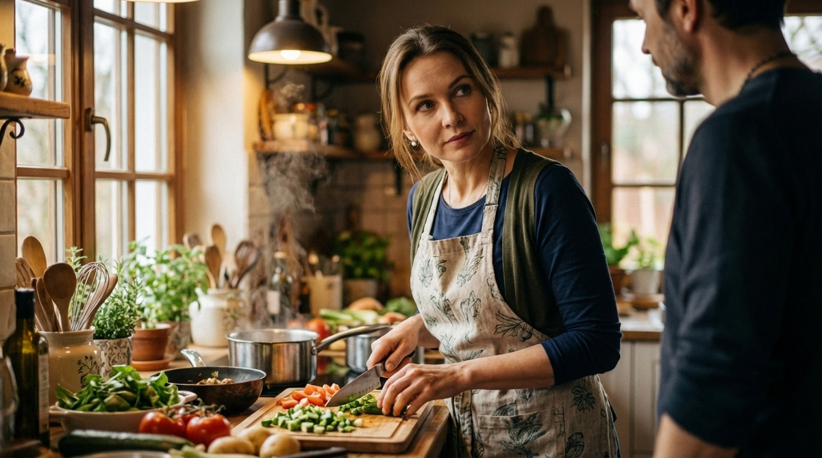 Лена стояла у разделочной доски и медитировала над луком. Не в смысле медитации — просто смотрела на него минуты три, пытаясь вспомнить, зачем вообще его достала. Ах да, салат. Оливье. Завтра приезжает мама.