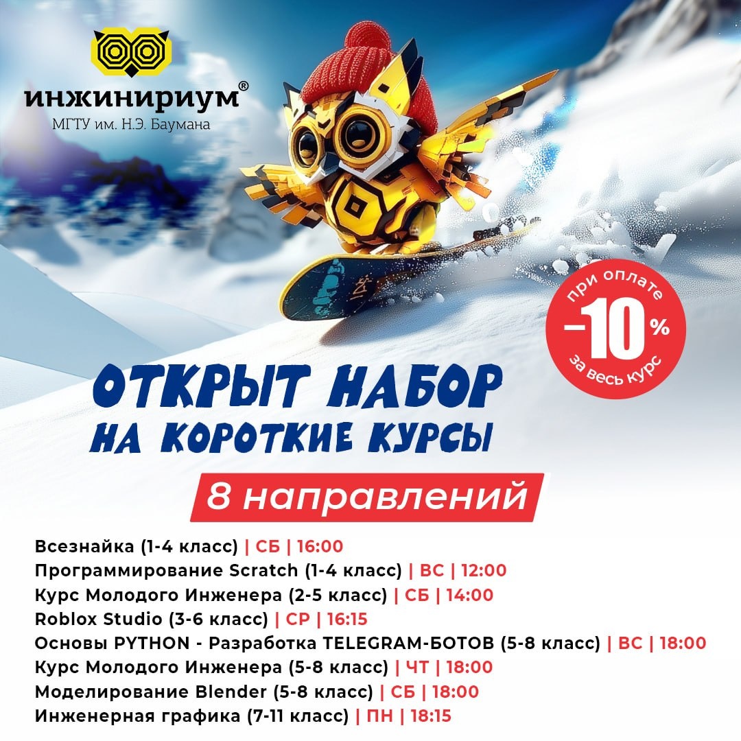 ❄️ ЗИМНИЙ СТАРТ В «ИНЖИНИРИУМ МГТУ им. Н.Э. Баумана»! ❄️ Скорость, энергия, уверенность — именно так начинается путь юного инженера! 🚀🦉 И да — это тот самый случай, когда вы точно не сомневаетесь, что делаете правильный выбор! ✔️ Почему зимние курсы — это супер-идея? 🤔 ✨ Они короче обычных почти в два раза! ✨ А это — МАКСИМУМ практики и БЫСТРЫЙ результат! ✨ Только польза и море удовольствия от процесса! 🔥 Этой зимой открыты 8 крутых направлений: 🔥 Основы PYTHON - Разработка TELEGRAM-БОТОВ (5-8 класс) | ВС | 18:00 Курс Молодого Инженера (2-5 класс) | СБ | 14:00 Курс Молодого Инженера (5-8 класс) | ЧТ | 18:00 Всезнайка (1-5 класс) | СБ | 16:00 Программирование Scratch (1-4 класс) | ВС | 12:00 Roblox Studio (3-6 класс) | СР | 16:15 Инженерная графика (7-11 класс) | ПН | 18:15 Моделирование Blender (5-8 класс) | СБ | 18:00 Вы сами увидите, как ваш ребёнок начнёт меняться: станет увереннее, самостоятельнее, смелее в идеях! 💡 🎯 Важно знать: 🗓 Старт: конец января / начал