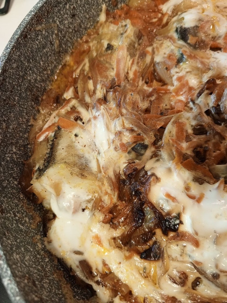 Минтай с овощами и грибами. Вообще рыба с грибами это очень вкусно! Здесь грибы белые, сушёные, измельчёные. Их не видно, но они есть! Аромат и вкус потрясающий. Жарить лук, морковь, грибы. Соль- перец. Сдвинуть о жареные овощи, под них выложить подготовленную рыбу. Томить минут 25, затем выложить сверху сметану и ещё подержать минут 10. Рыба готовиться очень быстро, огонь средний. Подавать с картофелем или рисом. Готовьте с удовольствием! #готовимдомавкусно #рыба #минтай #морковь #лук #грибы #тушить