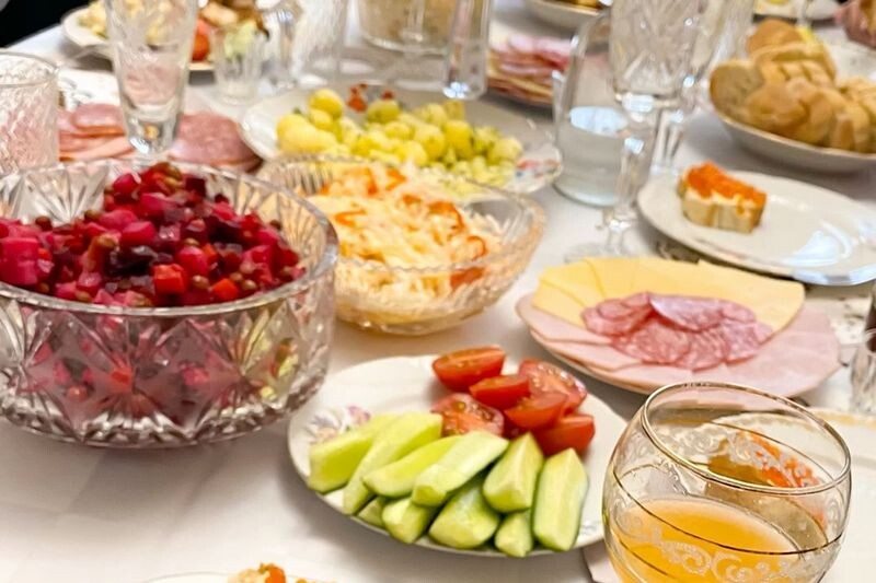 На застолье приглашали родственников, друзей, коллег. На этот случай почти в каждой семье имелся раздвижной стол. Если не было, занимали у соседей. Сначала на стол ставили салаты и бутерброды. Затем подавали горячее – пельмени, мясо по-французски, запечённую в духовке курицу, плов по-узбекски. Доставали из кладовки домашние заготовки: солёные помидоры, огурцы и патиссоны, варенье, конфитюры, компоты. Праздник становился отличным поводом обменяться рецептами – некоторые гости специально приходили с блокнотами и успевали записать парочку.