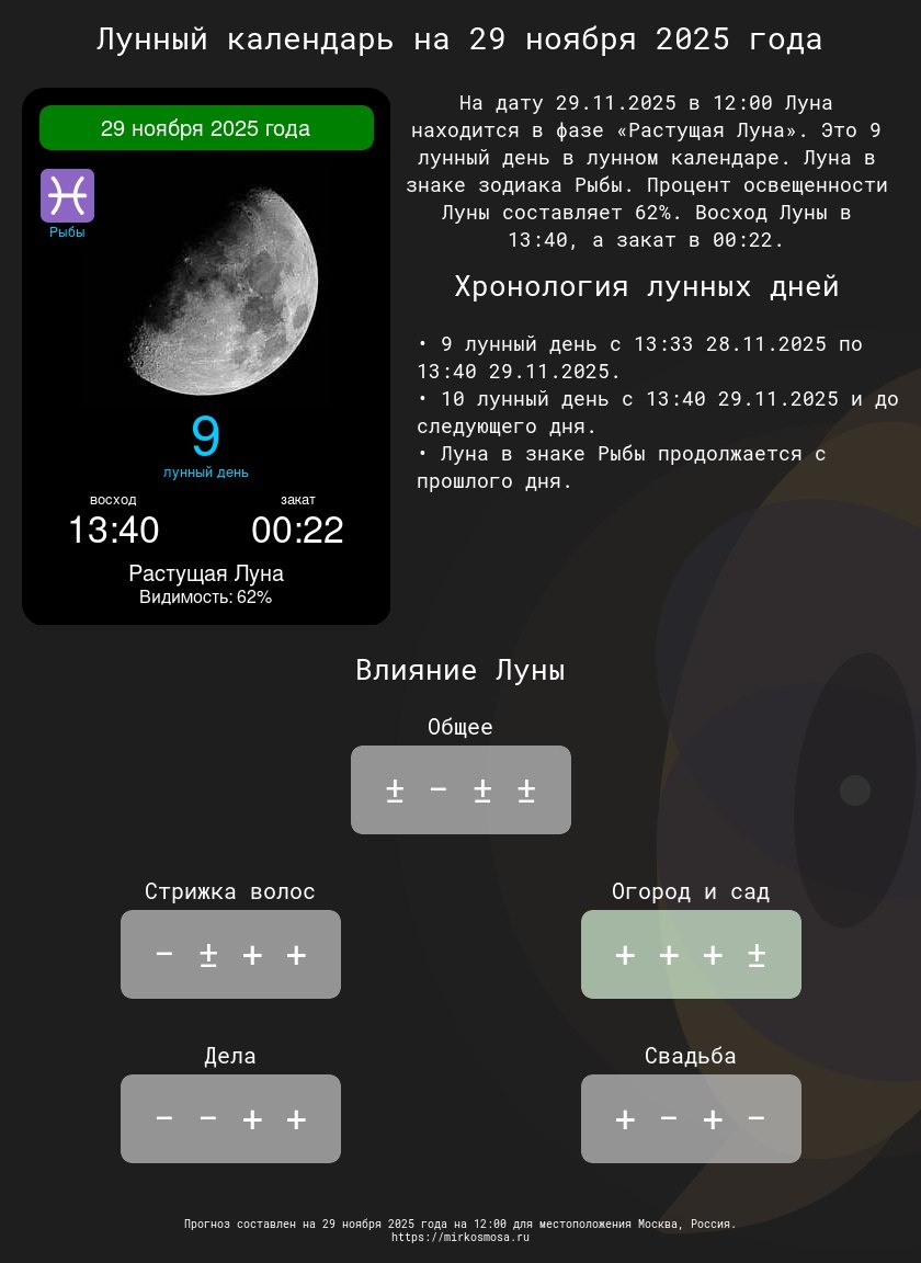 Лунные календари на 29 ноября 2025 года: Подготовьтесь к этому дню с учетом влияния Луны! 🔹🌗 Лунный календарь на 29 ноября 2025 года — Что приготовила Луна? Подробнее 🔹✂️ Лунный календарь стрижек на 29 ноября 2025 года — Подходящий ли день для обновления прически? Подробнее 🔹🌱 Лунный календарь огородника и садовода на 29 ноября 2025 года — Лучшее время для ухода за растениями. Подробнее 🔹📅 Лунный календарь дел на 29 ноября 2025 года — Удачные моменты для важных задач. Подробнее 🔹💍 Лунный календарь свадеб на 29 ноября 2025 года — Подходит ли этот день для вашего торжества? Подробнее