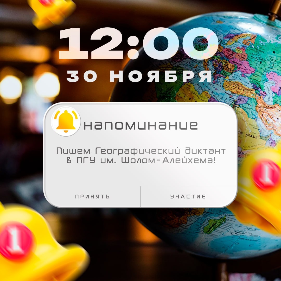 🌍 Уже завтра! Встречаемся на Географическом диктанте Напоминаем! 30 ноября (воскресенье) ПГУ имени Шолом-Алейхема станет площадкой Международной просветительской акции «Географический диктант — 2025». ❗️ ВАЖНАЯ ИНФОРМАЦИЯ ДЛЯ УЧАСТНИКОВ: ➖На площадку допускаются только лица, достигшие 18 лет. ➖Пожалуйста, обязательно возьмите с собой черную ручку. ➖ Не забудьте паспорт! В университете действует пропускная система. Место проведения: Учебный корпус №1 (ул. Широкая, 70а). ⏰Тайминг: • 11:00 – 12:00 — Сбор участников, регистрация и выдача бланков. Приходите заранее, чтобы успеть пройти контроль! • 12:00 – 12:15 — Инструктаж и викторина. • 12:15 – 13:00 — Написание Диктанта. До встречи! 👋 📲 МАХ