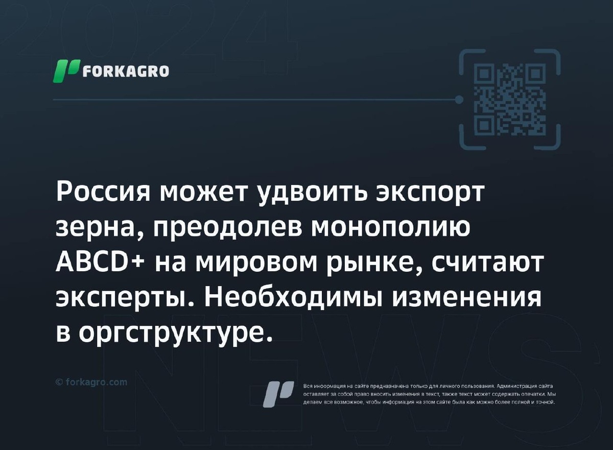 Россия может удвоить экспорт зерна, преодолев монополию ABCD+ на мировом рынке, считают эксперты. Необходимы изменения в оргструктуре. Директор Международного центра конкурентного права утверждает, что Россия может удвоить экспорт сельхозпродукции, если изменит структуру рынка, где сейчас доминируют крупные компании. Эксперты указывают на проблему монопольного положения ABCD+ на мировом рынке зерна и призывают к усилению экспорта. Несмотря на укрепление на внутреннем рынке, российским дилерам сложно пробиться на мировом уровне из-за стратегических ошибок. Корбут подчеркивает необходимость борьбы с глобальными монополиями и антимонопольное регулирование для увеличения экспорта. Перейти к источнику