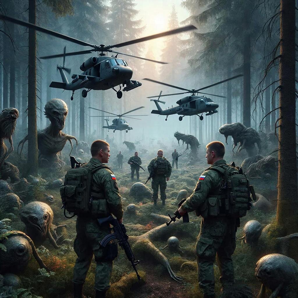 Дым рассеялся над тайгой, словно легкий туман, открывая перед глазами бойцов невиданное зрелище. Их вертолеты зависли в воздухе посреди незнакомого леса, окруженного странными существами и явлениями природы, совершенно чуждыми привычному миру.