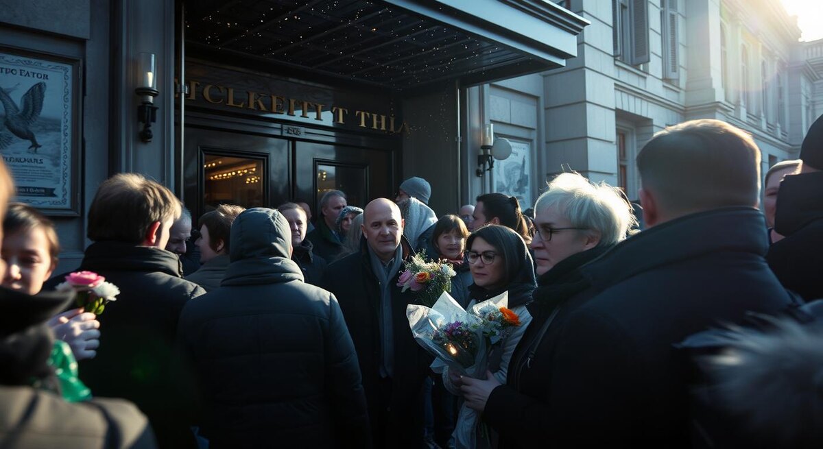 Эпицентр печали и сосредоточия эмоций — у входа, где уже расстелены ковровые дорожки для потока тех, кто придёт проститься. Никакого пафоса: хрупкие гвоздики и ромашки рядом с театральными программками прошлых лет, записки с надписью «Спасибо за правду» и «Ваши роли помогали жить». Горожане перешёптываются, делятся воспоминаниями: кто-то впервые увидел его на экране школьником, кто-то — стоя далеко у колонн, слушал его живой голос в спектакле, кто-то вспоминает, как он умел, одним точным взглядом, разворачивать сцену на 180 градусов. Внутри — репетиции тишины: технические службы и волонтёры осторожно выстраивают траектории, чтобы прощание было достойным и безопасным. Выхватываешь детали взглядом: свет приглушён, сукно на кафедре идеально выглажено, свечи в ряд, корзины с лентами от творческих коллективов и простых зрителей. Всё очень просто — и от этого пронзительно.