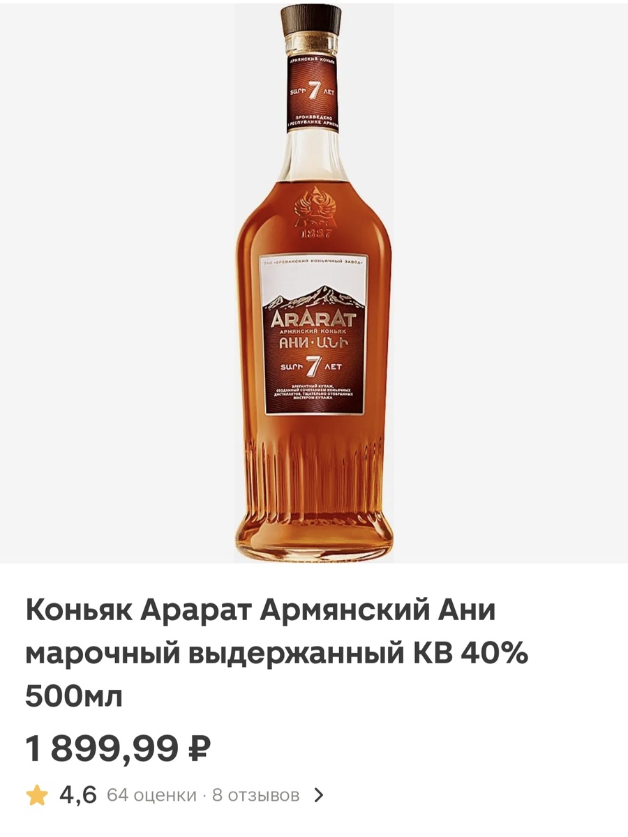 Арарат Ани 7 лет – относительно новый продукт на рынке. До этого Ани был 6-летним, но сейчас речь об актуальной версии. Купить его можно не только в «Магните», он представлен почти во всех магазинах. Цена от 900 рублей до 2000 (в зависимости от акции) за 0,5 л, крепость 40%. Стоит ли он своих денег – давайте разбираться. Аромат абрикосово-цветочный, еле уловимая медовость, лёгкая парфюмность и дубовая нотка, довольно прямолинейная. Уровень пятилетнего Арарата старого розлива с добавлением лёгкой древесной примитивности. Вкус цветочный и фруктовый с преобладанием подвяленного абрикоса и снова эта прямолинейная дубовая горчинка. Довыдержка производителем своих коньяков, на мой взгляд, идёт в минус нынешнему Арарату. Послевкусие короткое, цветочное с горчинкой. Более подробный видеообзор можно посмотреть здесь: Вывод по этому коньяку такой: к обильному столу в дачный сезон – отличный вариант. Наслаждаться им и искать в нём самодостаточность не получится. Старый Ани был заметно пло
