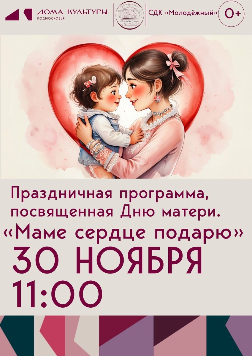 ✨ Праздничная программа, посвящённая Дню матери: «Маме сердце подарю» в пос. Молодёжный 🎙 В 11.00 пройдёт концерт младших групп, в 12:30 старших групп творческих коллективов. 🥖 В 12.00, начнётся благотворительная ярмарка, где будут выставлены на продажу кулинарные изыски мастериц п. Молодежный. 💝 На собранные средства будут приобретены новогодние подарки для детей-инвалидов и одиноких пожилых жителей проживающих в посёлке. 🚫 Возраст: 0+ 📆 30.11.2025 🕒 11:00 🏢 СДК «Молодежный» 📍 г.о. Подольск, пос. Молодёжный, д.30 💰 Цена: 100 ₽ 🎫 Купить билет: https://clck.ru/3QMpST и http://clck.ru/3QMqC4 ⭐Поддержать канал голосом 🍰Где поесть в Подольске ✅ Мероприятия Подольск https://dzen.ru/id/66ed500f7b5671493eca3fd6 http://vk.com/podolsk_events http://dzen.ru/podolsk_events