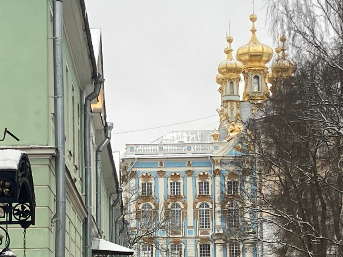 Вот они - золотые купола дворцовой церкви. В детстве и в школьные годы очень любила я эту не отреставрированную облупившуюся церковь внутри дворца, она мне казалась очень таинственной и красивой. Она и есть красивая. Но сейчас отреставрировали ее. Вот и надпись о реставрации. Я впервые пришла посмотреть как ее сделали. Церковь была построена при императрице Елизавете, в ее любимых тонах - берлинская лазурь и золото. А на росписях - картины, иллюстрирующие Библию. Вот такая лестница на церковные хоры. А за окошком виден дворец и площадь перед ним. День пасмурный, в такие дни только и ходить в музеи, чтобы полюбоваться красотой.