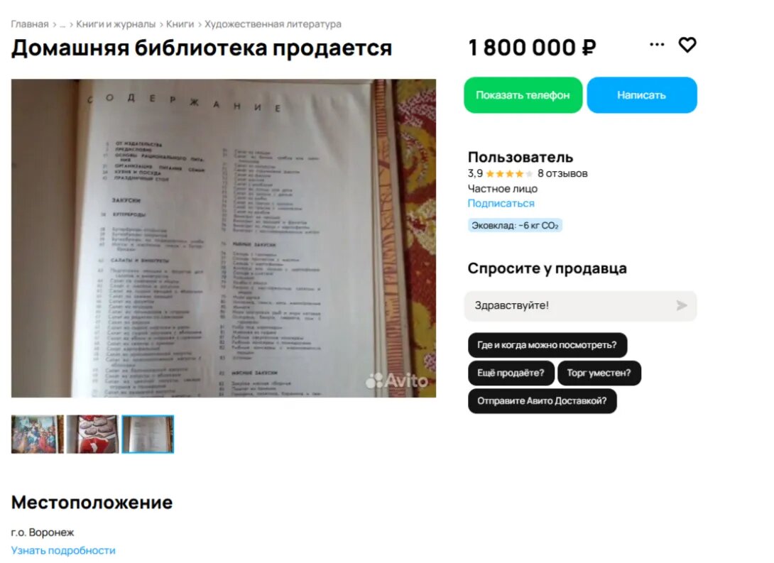 Необычное объявление появилось на «Авито». Его автор уверят, что домашняя библиотека насчитывает около 20 тысяч книг. Огромная коллекция, согласно объявлению, включает издания как отечественные, так и зарубежные. Соответственно, представлены в собрании и русские, и иностранные писатели. Кроме того, домашняя библиотека, по уверению автора, содержит уникальные экземпляры, изданные еще в 19 веке. Что касается жанров, то в коллекции есть и классика, и фантастика, и беллетристика, а также книги по кулинарии, токарному делу, садоводству. Представлена и детская литература. Последние книги домашней библиотеки датируются 2015 годом. За всю коллекцию ее владелец просит 1 млн 800 тыс рублей.