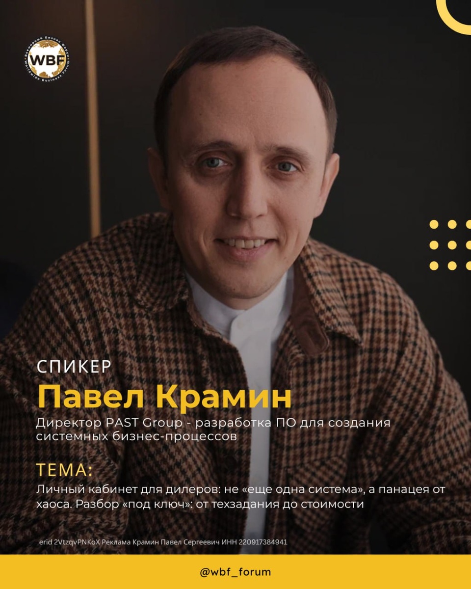 СПИКЕРЫ ВСЕМИРНОГО БИЗНЕС ФОРУМА 🎙 ПАВЕЛ КРАМИН - Директор PAST Group - разработка ПО для создания системных бизнес-процессов. — в портфолио более 200 проектов для производств, торговли и услуговых бизнесов; — автор блога по автоматизации; — Золотой партнер Битрикс24, эксперт-партнер МойСклад — основатель продукта аналитических SaaS-сервисов для селлеров "Где деньги, Озон?!" — основатель продукта мессенджера для отдела продаж "Диалого" ➡️ ТЕМА: Личный кабинет для дилеров: не «еще одна система», а панацея от хаоса. Разбор «под ключ»: от техзадания до стоимости ➡️ Контакты Сайт: past-group.ru Телеграм: @pavel_kramin https://vc.ru/pavel_kramin ************ 🎙 ЕВГЕНИЙ КОНОВАЛОВ - Сооснователь платформы Domino CRM; обучил работе с искусственным интеллектом более 200 предпринимателей в Х10 академии; более 15 лет опыта в IT-сфере (телекоммуникации, банковский сектор, кибербезопасность, CRM-системы); 10+ лет опыта в управлении проектами в РФ и Гонконге; реализовал десятки успешных внедрени