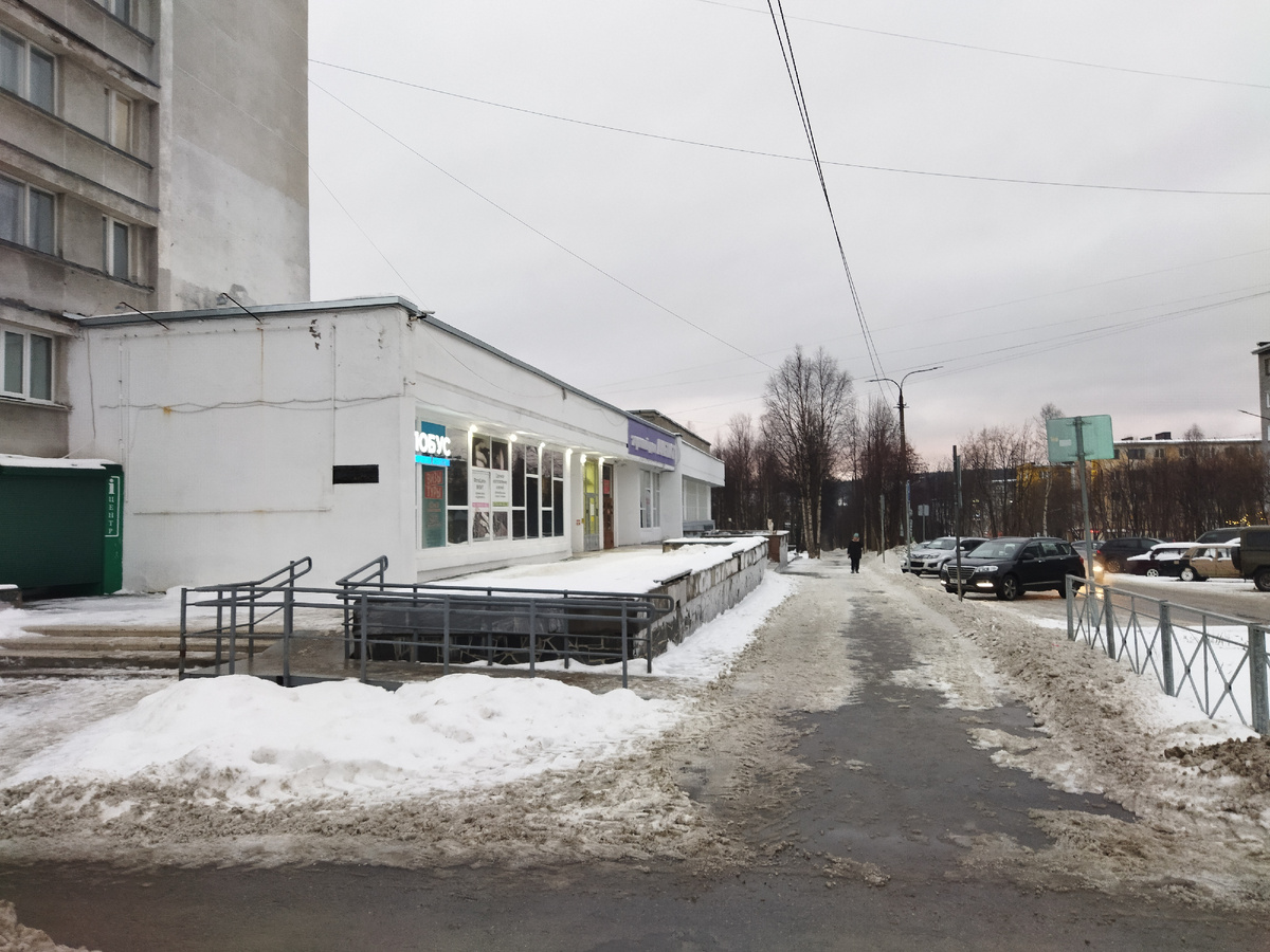 Завëл будильник на 9:40, но проснулся раньше. Последний раз поел в комнате для приëма пищи. Ел хачапури с сыром и творог с мëдом. Хачапури и творог куплены вчера, а мëд в третий день поездки. Дособрал вещи и выселился из гостиницы в 11 часов. Сделал фотографию входа в гостиницу при дневном свете. Фотография. Вход в гостиницу "Аметист" в Апатитах. Вчера навигатор показал, что мне надо идти довольно далеко на остановку у городского рынка. Так я узнал, что в Апатитах есть рынок. Сегодня навигатор показывал другой маршрут, но я решил идти к рынку. Идти непросто, потому что сумка получилась очень тяжëлая, рука вырывалась из плеча. Плюс ещë снег подтаял, и образовалась слякоть. Автобус № 130 приехал по расписанию в 11:39. Я загрузился. Пришлось поставить сумку на грязно-мокрый пол. Интересно, что в Апатитах оплачивают проезд при выходе, а не при входе. Это я заметил, ещë когда ехал на маршрутке из Кировска. Но сегодня меня удивило, что люди столпились у выхода, но не выходят. Оказалось