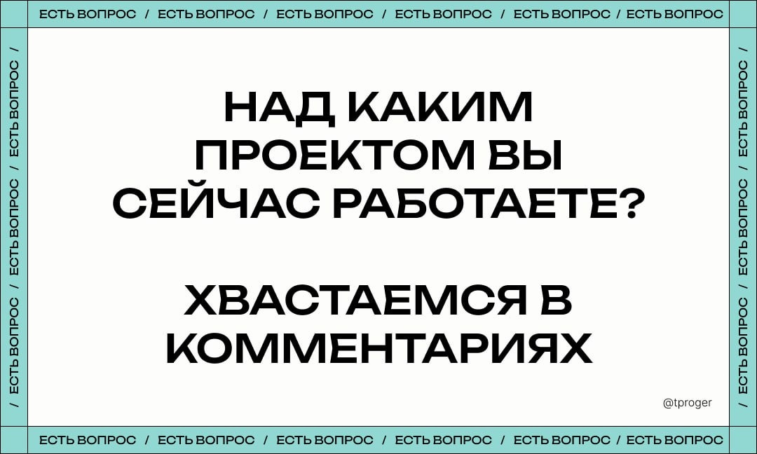 В ответ на пост Пора хвастаться! На прошлой неделе мы запустили рубрику, где вы можете хвастаться своими проектами. Кое-кто уже начал это делать, но остальные пока скромничают. Не стесняйтесь. Делитесь своим прогрессом, даже если проект пока не закончен! Поверьте, это помогает мотивации 😉 А если вы разработчик игр и хотите похвастаться своей игрой, то залетайте в наш «субботний скриншотник» в GameDev-канале.