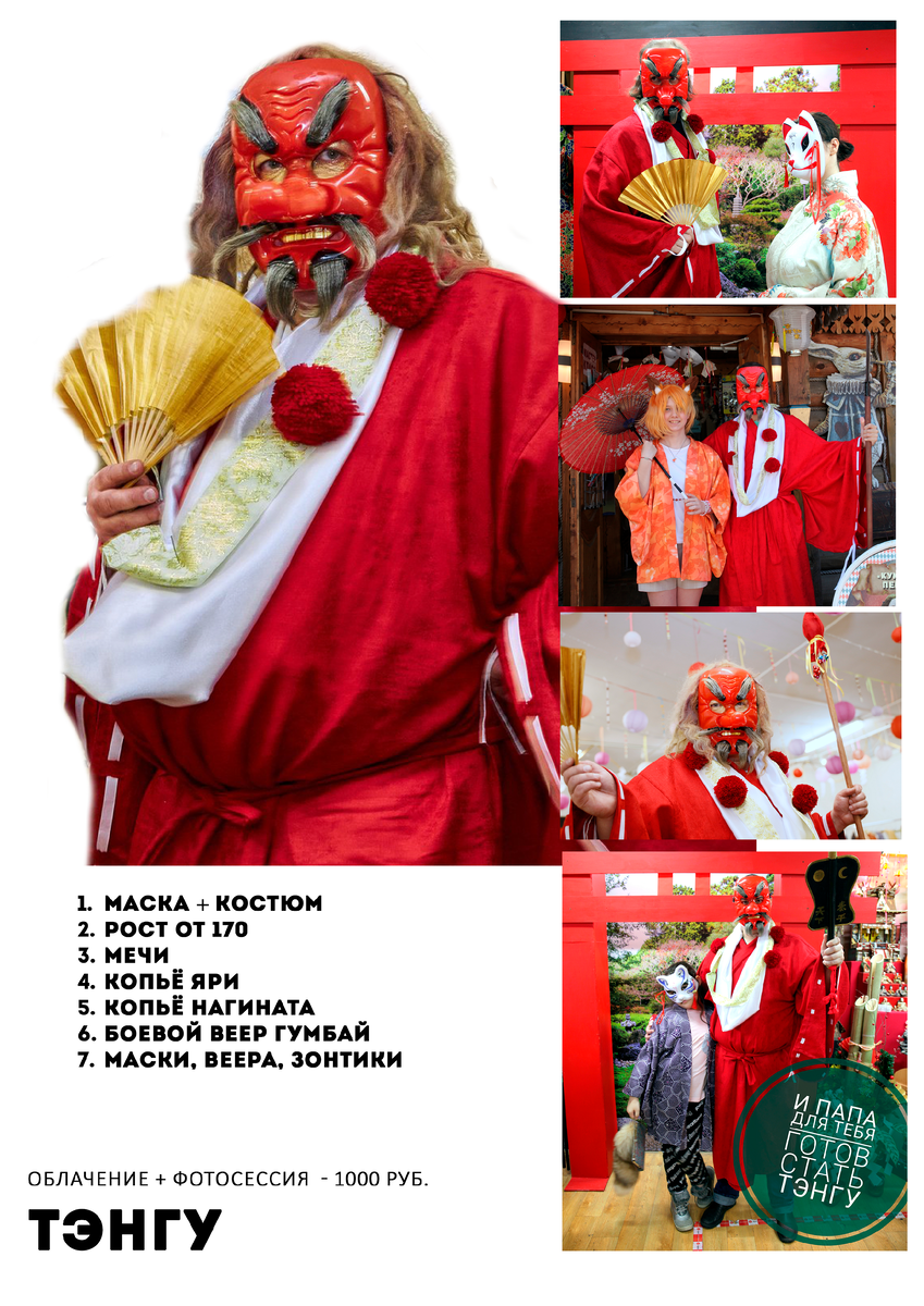 Дорогие друзья! Продолжаем знакомить всех интересующихся с нашими японскими костюмами для фото на память. Как вы знаете, все желающие могут бесплатно сфотографироваться, используя маски, веера, сумочки, шлемы и японское вооружение. А вот сложное облачение и съемки можно сделать за дополнительную плату. Сегодня вы можете посмотреть какие возможности и варианты открываются с фестивальным костюмом главного японского ёкая Тэнгу. Костюм рассчитан на рост от 170 см подходит рослым подросткам и взрослым, мужчинам. В качестве вооружения и аксессуаров мы предлагаем любые мечи из нашего арсенала, копья яри и нагината, боевой веер гумбай, разные маски, веера и зонты. Ну, а что получается – смотрите сами. Мы подготовили для вас программу «Японский Новый год». Программа состоит из экскурсии, во время которой мы расскажем о традициях празднования Нового года в Японии, покажем различные ритуальные предметы и куклы, связанные с этим праздником, познакомим вас с японскими новогодними сказками. После э