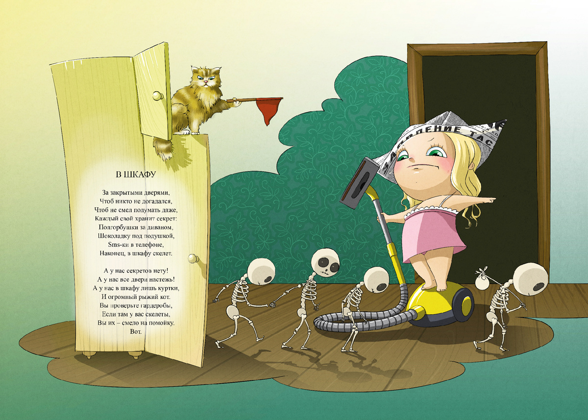 За закрытыми дверями, Чтоб никто не догадался, Чтоб не смел подумать даже, Каждый свой хранит секрет: Полгорбушки за диваном, Шоколадку под подушкой, Sms-ки в телефоне, Наконец, в шкафу скелет. А у нас секретов нету! А у нас все двери настежь! А у нас в шкафу лишь куртки, И огромный рыжий кот. Вы проверьте гардеробы, Если там у вас скелеты, Вы их – смело на помойку. Вот.