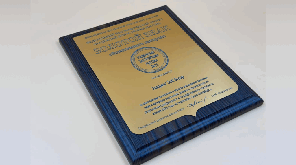27 ноября в Дворце Конгрессов в Стрельне холдингу Setl Group вручили золотой знак «Надёжный застройщик России‑2025» — одну из самых престижных федеральных общественных наград. Награду дают за безупречное соблюдение прав и интересов дольщиков: её получают только девелоперы, к которым в текущем году не было претензий у контролирующих органов. Отбор проходит в два этапа: Организатор оценивает сотни компаний по России и десятки — на Северо‑Западе. Setl Group получает эту награду не первый год. Кроме того, Единый ресурс застройщиков присвоил компании максимальный балл надёжности — 5, что подтверждает сдачу всех домов в срок.