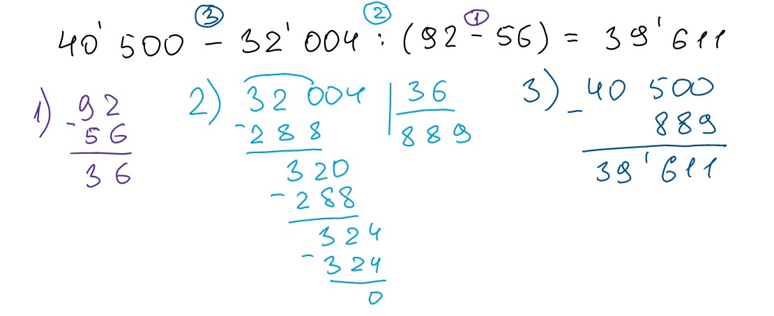 г) 417 608+15 234 • 32+523 791 Прядок выполнения: 1. Переписать выражение на бумагу 2. Расставить номера действий над выражением 3. Под выражением выполнить действия Порядок действий — золотое правило: 1. Действия в скобках 2. Умножение и деление (слева направо) 3. Сложение и вычитание (слева направо) Пример разбора 40 500−32 004:(92−56) Действие 1: Скобки