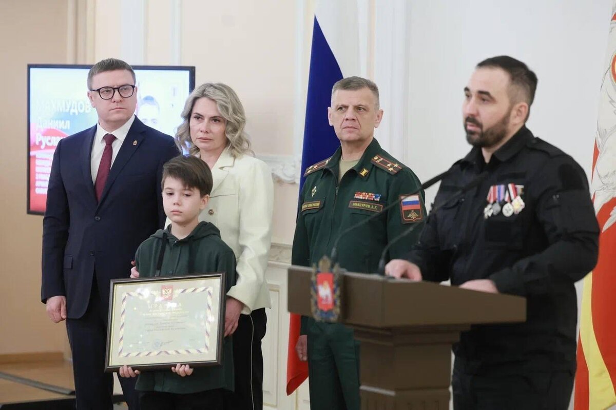 Семье погибшего южноуральского бойца передали «Золотую Звезду» Высшую государственную награду семье Даниила Махмудова вручил губернатор Челябинской области Алексей Текслер. 🔖Во время боев за Авдеевку Даниил получил ранение. Но, несмотря на это, остался прикрывать раненых товарищей и вел огонь из пушки подбитого бронетранспортера. За проявленный героизм Указом президента России Даниилу Махмудову присвоено звание Героя Российской Федерации. — С нами нет боевого офицера Даниила Руслановича Махмудова, но он будет вечно жить в нашей памяти, в памяти всех жителей Челябинской области и всей страны, как и все герои специальной военной операции, — обратился к участникам церемонии глава региона. ⏺ Отец Даниила — Руслан Чингисович продолжает работу в зоне СВО, занимается поисковыми работами. Недавно ему вручили Орден Мужества.