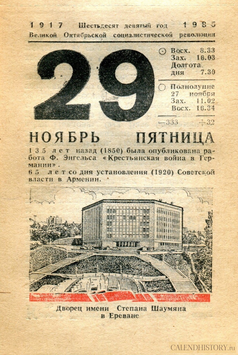 Листок советского отрывного календаря 40-летней давности 29 ноября 1985-го года — Календарь Политиздата 135 лет назад (1850) была опубликована работа Ф. Энгельса «Крестьянская война в Германии». 65 лет со дня установления (1920) Советской власти в Армении. Дворец имени Степана Шаумяна в Ереване Больше старых советских отрывных календарей смотрите у нас на сайте - calendhistory.ru https://calendhistory.ru/29-nojabrja-1985-go-goda-kalendar-politizdata/