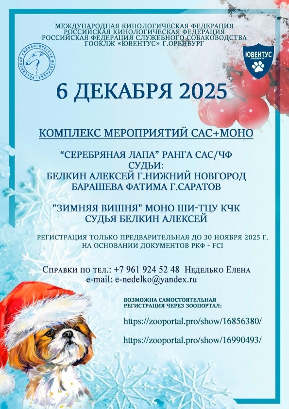 ⏰ 6 дек (7д) 🏛 #Оренбург #Россия #Выставка 🐶 Выставка собак: СЕРЕБРЯНАЯ ЛАПА 🏆 Клуб любителей животных "Ювентус" Контакты организаторов здесь: 🌐 https://www.petsman.ru/vystavki-sobak.php?mesto=45-orenburg "СЕРЕБРЯНАЯ ЛАПА" САС/ЧФ "ЗИМНЯЯ ВИШНЯ" Моно ШИ ТЦУ ранга КЧК 🧑 👨 Эксперты: 🔹 Алексей Белкин 🔹 Фатима Барашева