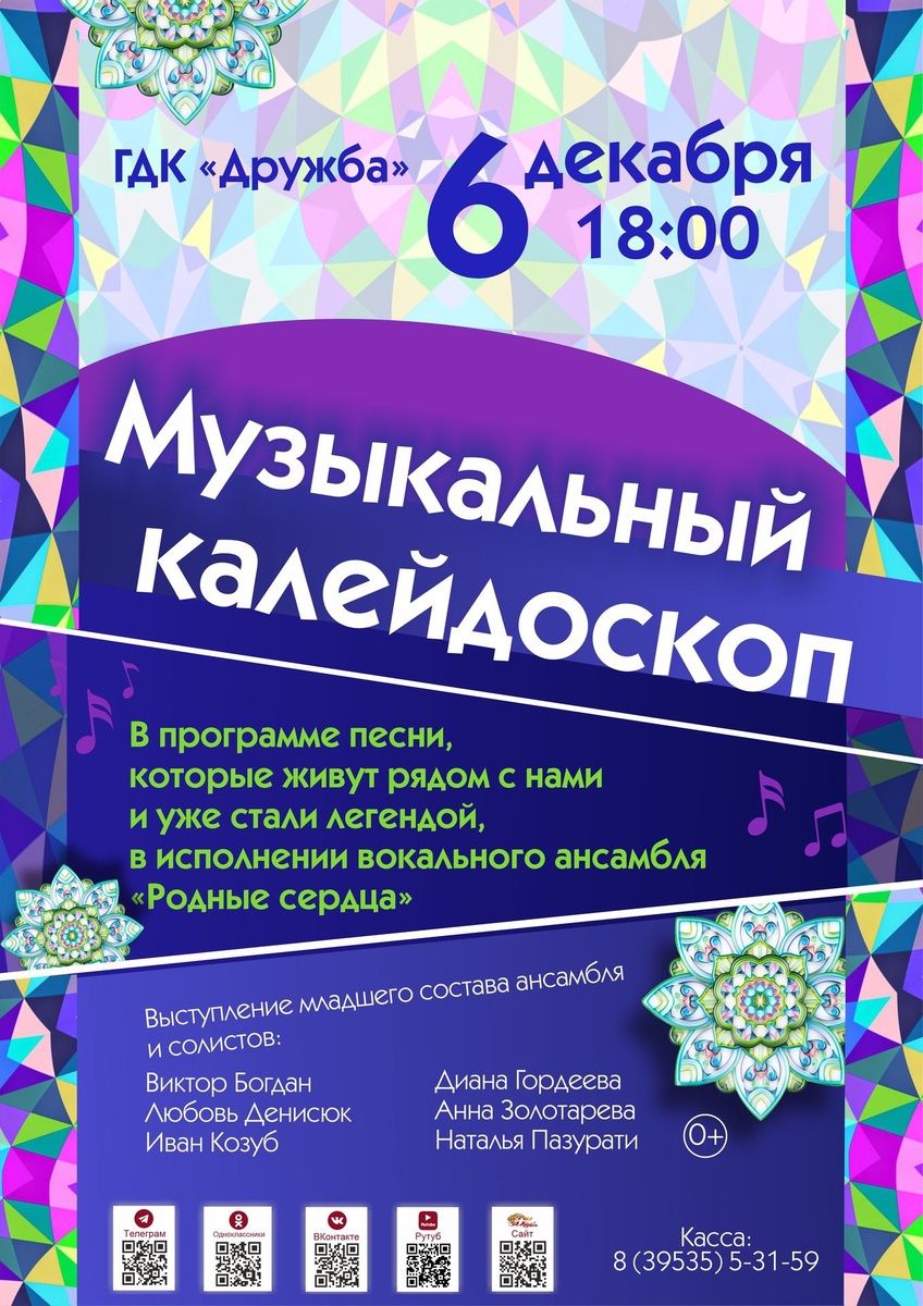 "Музыкальный калейдоскоп" - концерт вокального ансамбля "Родные сердца" 🗓6 декабря 🕕 18.00 Приглашаем всех, кто любит песни советской эстрады, ставшие уже легендами. Приглашаем всех, кто любит русские, казачьи народные песни. Приглашаем всех, кто любит вокальный ансамбль “Родные сердца”! В программе: выступление младшей группы коллектива и солистов – Виктора Богдана, Любови Денисюк, Ивана Козуба, Дианы Гордеевой, Анны Золотаревой, Натальи Пазурати. Касса: 8-(395-35)-5-31-59.