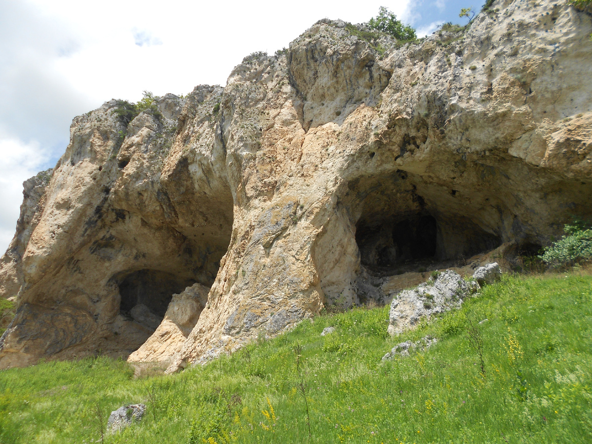 В этих точках мне довелось побывать дважды, и оба раза- в рамках конного тура. Поэтому фото опять будут разные- летние и сделанные ранней весной, в конце марта. Все фото в статье личные. Конная прогулка от посёлка Победа и обратно заняла 6-7 часов, с осмотром грота Череп и обедом на скале Галкина (нашу мини-группу инструктор никуда не торопил, гуляли сколько хотели), проехали в седле в общей сложности около 20 км. Проехав через дубовый лес, оставляем коней на поляне, где есть развилка- по одной тропе можно дойти до Черепа, по другой- подняться на одну из самых высоких точек хребта- скалу Галкина. Скала находится на высоте 1211 м над уровнем моря, на мой взгляд, это самая классная обзорная площадка в Адыгее! На скале в марте- деревья ещё голые, листайте А летом зелёные деревья на горах напоминают волны моря, листайте В ясную погоду отсюда можно разглядеть даже Эльбрус, но мне не совсем повезло- облака всё-таки частично закрывали обзор. Зато нагулялась вдоль обрывов до головокружения