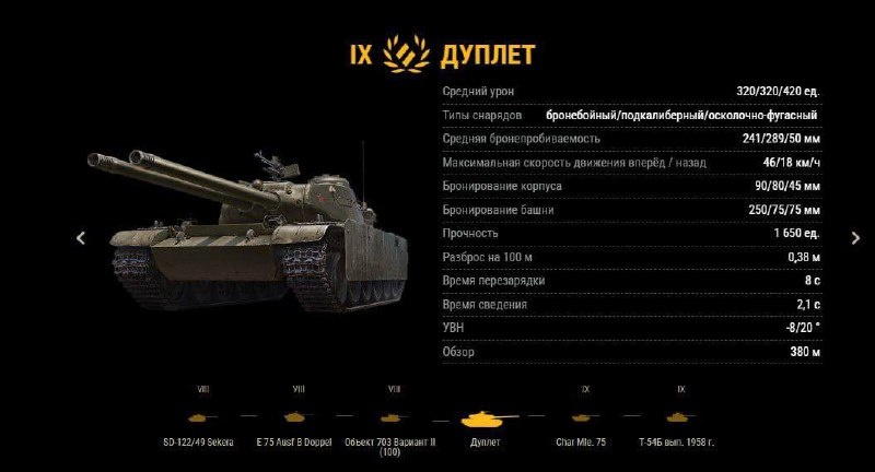 Новая СТ 9 уровня — ДУПЛЕТ Встречайте свежачок в ангаре — ДУПЛЕТ, советская премиумная СТ-9 с двухстволкой. Раз уж разработчики подкинули такую интересную игрушку, пора разобрать её по полочкам 🗞Основные ТТХ: • Урон: 320/320/420 • Пробитие: 241/289/50 мм • Залп: 640 урона • Перезарядка: 8 сек • Сведение: 2.1 сек • Разброс: 0.38 м/100 м • УВН: −8° / 20° • Прочность: 1650 HP • Броня башни: 250/75/75 мм • Броня корпуса: 90/80/45 мм • Скорость: 46 / 18 км/ч • Обзор: 380 м 🔍 Ключевые особенности: ✅Плюсы: • Мощный двойной залп на 640 урона • Невероятно комфортные −8° УВНов для советов • Башня что-то танкует • Хороший обзор — 380 м ❌ Минусы: • Корпус уровня «картонка из-под холодильника» • Для СТ динамика оставляет желать лучшего • 5 секунд между выстрелами залпа — чувствуется Вердикт: С одной стороны, ДУПЛЕТ даёт то, чего у советов почти не бывает: шикарные УВН и мощный залп. С другой — динамика слабовата, корпус пробивают все, кому не лень, а башню тоже идеально не назовёшь. Поте