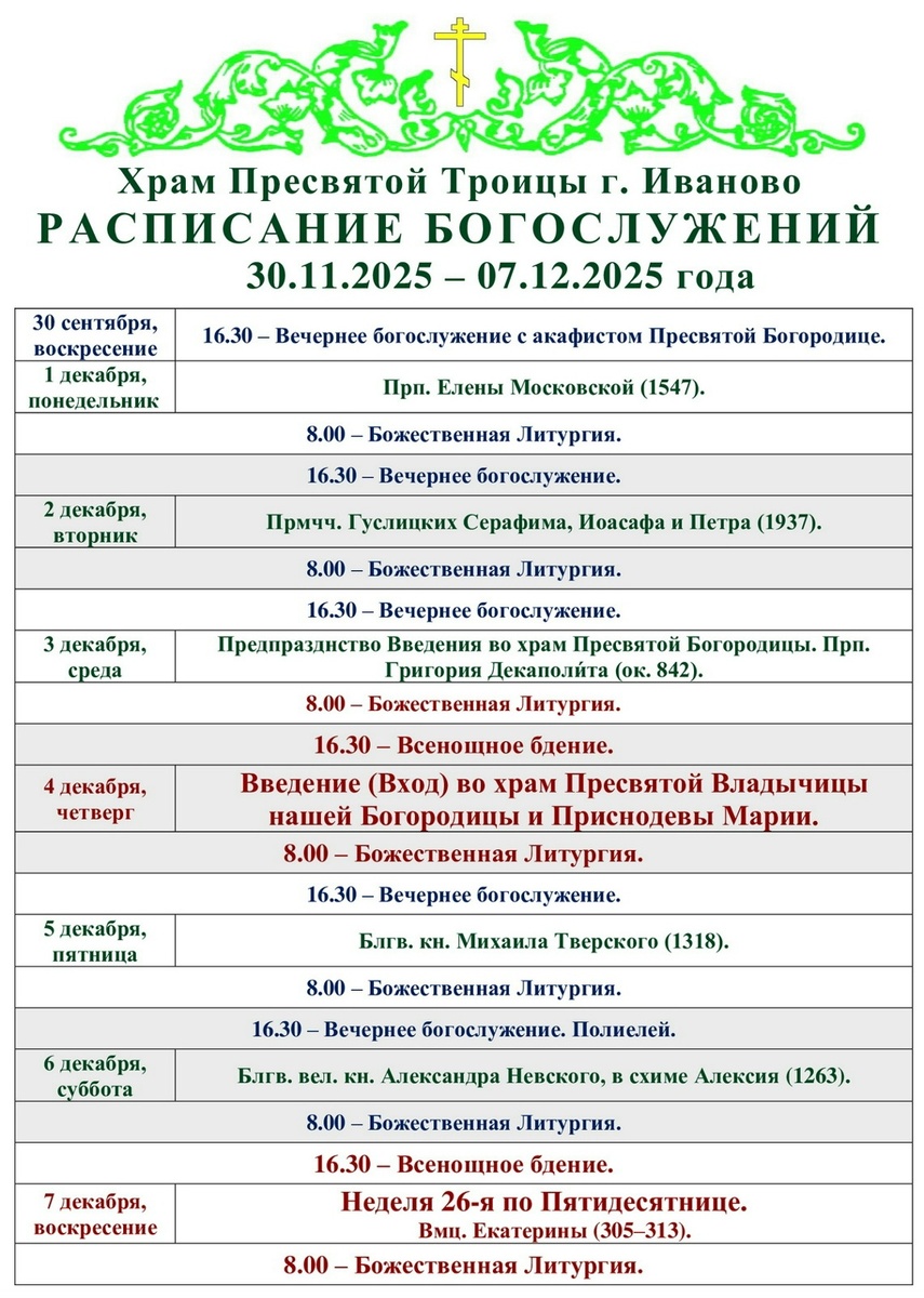 30.11-07.12. Расписание богослужений в Троицком храме г. Иваново