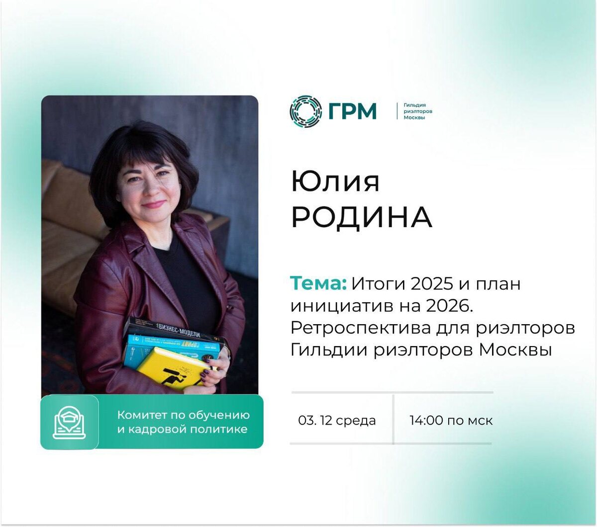 Ретроспектива 2025 и план инициатив на 2026! 📌 Встреча для риэлторов Гильдии риэлторов Москвы Чтобы двигаться вперёд, важно понимать, что изменилось за год, какие компетенции усилились и где нужна поддержка. На этой встрече мы сделаем полный разбор событий 2025 и наметим конкретные шаги на 2026. 🗣 Спикер: Юлия Родина — бизнес-тренер, коуч лидеров и команд, с опытом разработки продуктов и услуг в девелопменте (ГК «Самолёт») и для банков. На встрече разберём: ➖ Главные события 2025: что усилило ваши компетенции, где нужна поддержка ➖ Влияние разных сторон: банки, государство, партнёрства, клиенты и др. ➖ Топ-инициативы для проработки на Q1-2026 ➖ Личный шаг на январь — сразу в календарь 📆 Дата: 3 декабря (среда), 14:00–16:00 📍 Место: Москва, Спартаковская улица, 5с1 (Банк ВТБ) Регистрация обязательная! ⚠️ Участие бесплатное только для членов ГРМ 💡Приходите, чтобы закрыть год с ясной картиной и готовым планом действий на 2026!