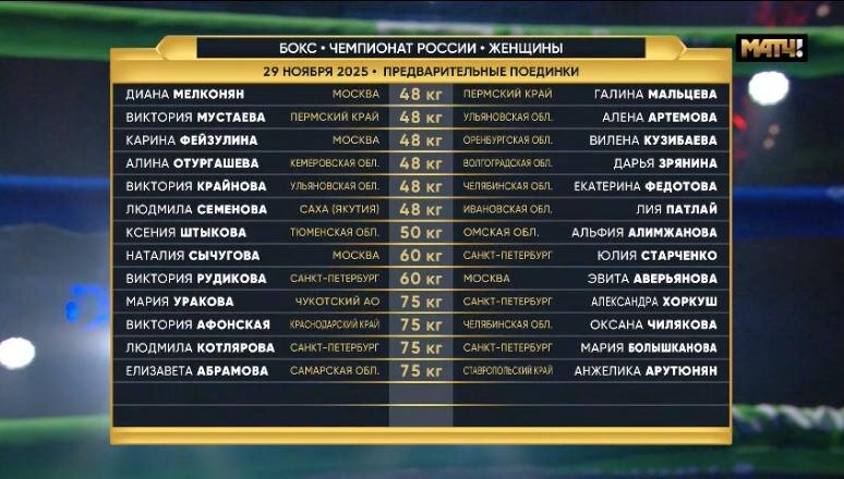 Переносимся в Уфу, где стартует чемпионат России по боксу среди женщин 🥊🥊🥊🥊 Утренняя сессия начинается уже сейчас. В ринг выйдут спортсменки в категориях 48 кг, 50 кг, 60 кг и 75 кг. ССЫЛКА НА ТРАНСЛЯЦИЮ 📺 Дневная сессия начнется в 14:30 МСК. ССЫЛКА НА ТРАНСЛЯЦИЮ 📺 А параллельно следим за финалом Кубка вооруженных сил РФ по армейскому рукопашному бою. ССЫЛКА НА ТРАНСЛЯЦИЮ 📺