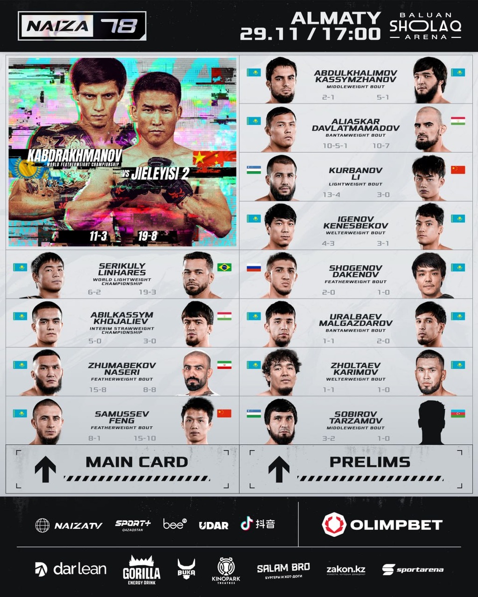 🎖️Полный кард турнира NAIZA 78! 29 ноября! Начало прямого эфира в 15:00 по Москве! 📺Где смотреть ❓⬇️ Видеосервис WINK Кинопоиск Билайн ТВ НТВ-ПЛЮС 🇺🇿 Телеканал UDAR в Узбекистане 🇧🇾 Телеканал UDAR в Республике Беларусь KOT-TV T1-Групп 🇰🇿 Телеканал UDAR в Казахстане Кинопоиск Alma-TV 🇰🇬 Телеканал UDAR в Киргизии MEGA-TV О!-TV 🇦🇲 Телеканал UDAR в Армении