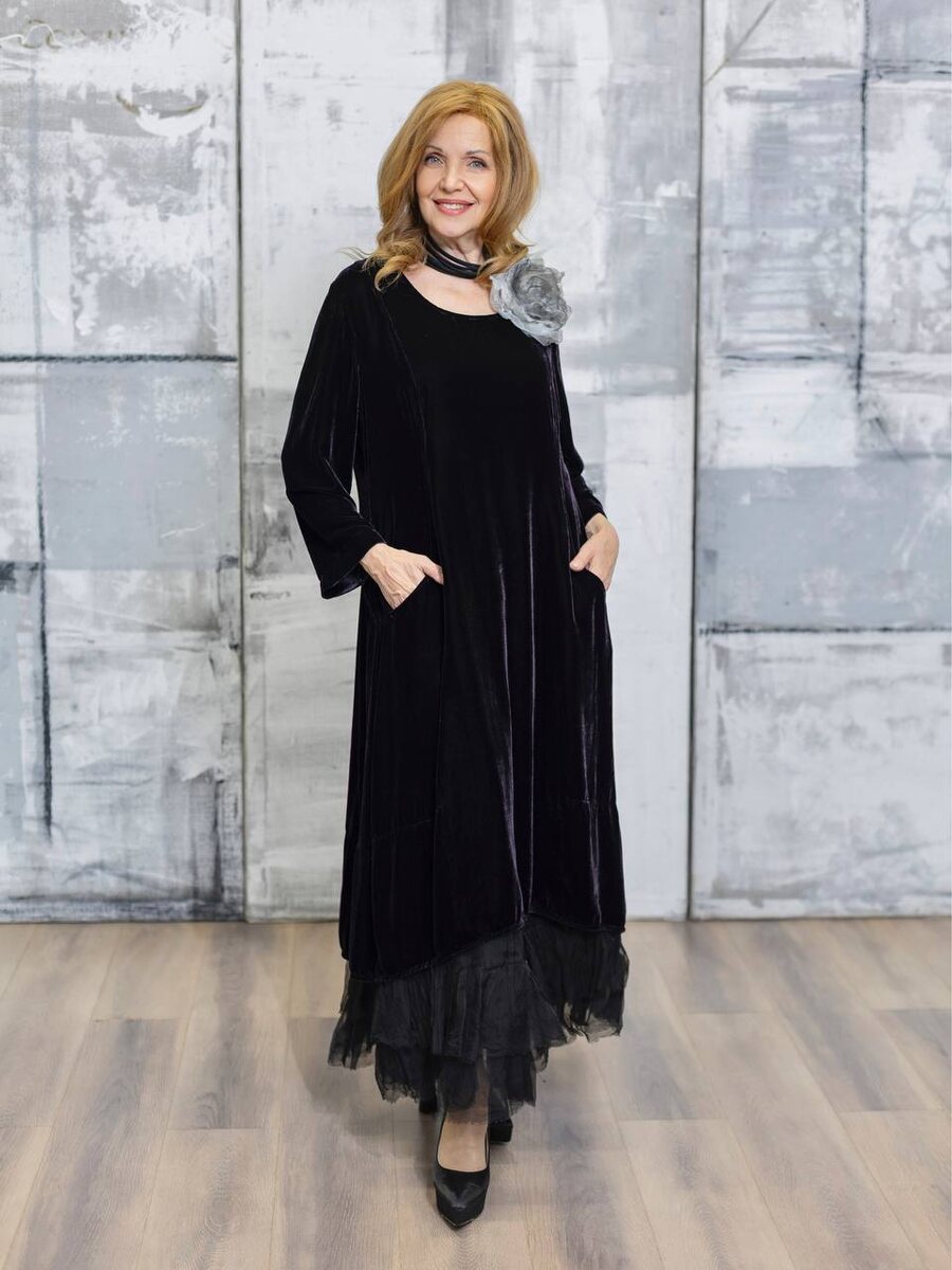 Уважаемые партнеры Sollery! Мы в Sollery постоянно ищем для вас уникальные находки, способные по-настоящему вдохновить и выделить ваш ассортимент. Сегодня мы с особым удовольствием представляем воплощение элегантности и богемного шика от бренда GRIZAS – дуэт, который моментально станет хитом в вашем бутике! Встречайте: великолепное черное бархатное платье. Это не просто наряд, это ода красоте и чувственности. Глубокий, насыщенный черный цвет бархата придает платью невероятную роскошь и таинственность. Бархат сам по себе – материал с характером, его мягкий переливчатый блеск и тактильное совершенство делают каждое движение грациозным. Оно универсально и всегда актуально, становясь фундаментом для множества стильных образов. Идеальным компаньоном для этого бархатного великолепия выступает шелковый черный подъюбник в стиле бохо. Это не просто дополнение, а самостоятельный стилистический акцент, который раскрывает новые грани многослойности и изысканности. Созданный из струящегося прозр