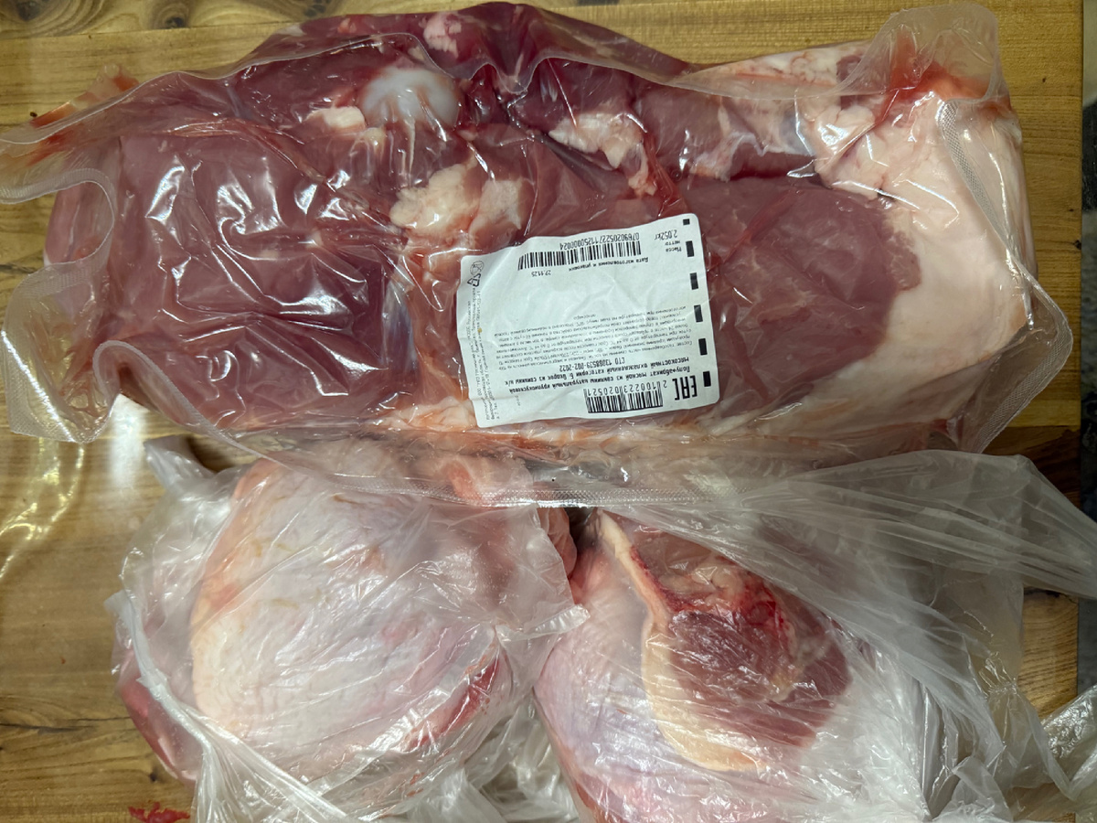 Как я уже говорила, под конец месяца красный банк от щедрот своих отсыпал мне аж 5 % кэшбэка на продукты. Я про это писала здесь: Такие предложения бывают нечасто, поэтому я решила на все свободные деньги закупиться продуктами с расчетом до конца января. Конечно, я буду докупать овощи-фрукты и кисломолочную продукцию, но все, что может долго храниться, я решила взять с 5%-м кэшбэком. В пятницу вечером я поехала в Одинцово - кстати, в том числе и для того, чтобы подготовить давно обещанный вам фотоотчет о ремонте в квартире! Студент молодец, поддерживает порядок и чистоту. За это я ему отвезла немножечко еды )))) из ранее сделанных закупок: И заехала в магазин Мясницкий ряд, где купила еще немного мяса и хинкали. Взяла спил окорока с косточкой, куриные окорочка и 2 рульки. Окорок уже запекла с картошкой в том самом сидре, который конфисковала у студента в прошлый раз: Потом на запеченной косточке сделаю борщ. Наконец-то мне досталось немного куриной печени, взяла 2 мешка хинкали (о